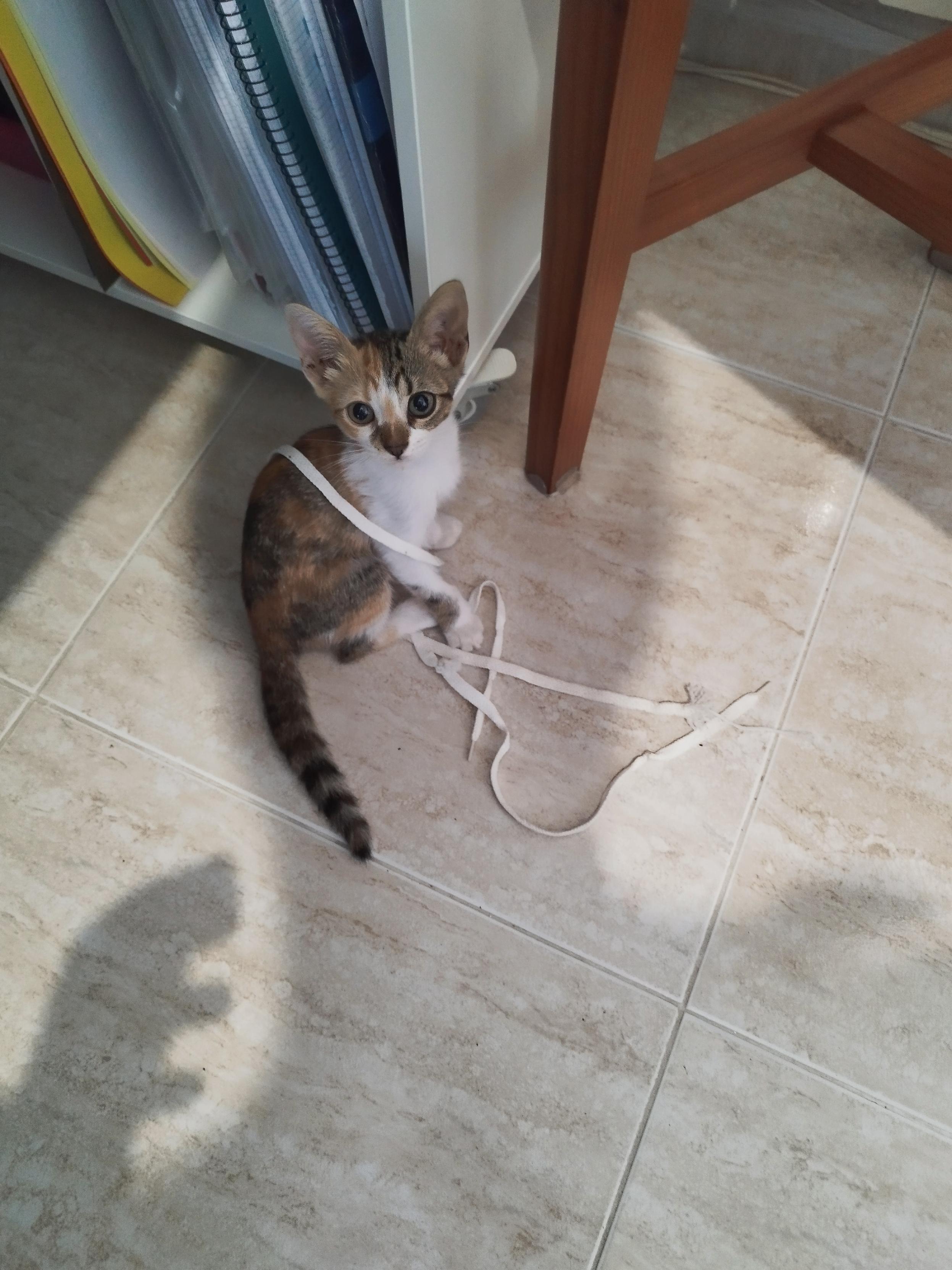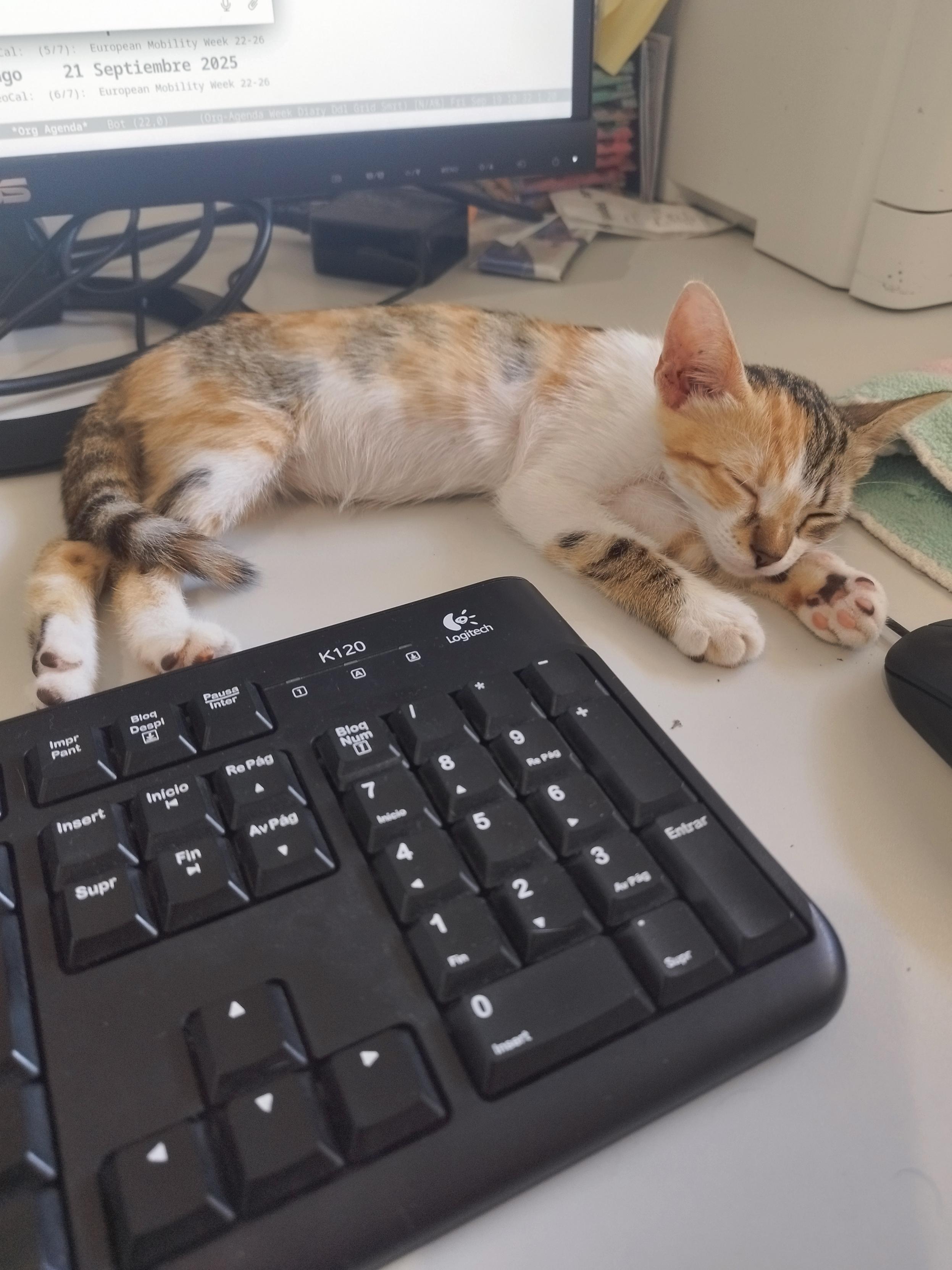 Hace un par de semanas abandonaron una gatita bebe junto a la casa de mis padres, empezó siguiendo a mi hija y hemos acabado cuidándola mientras le buscan hogar en una asociación (nosotros ya tenemos dos gatos -e hijos- en un piso 🫨).