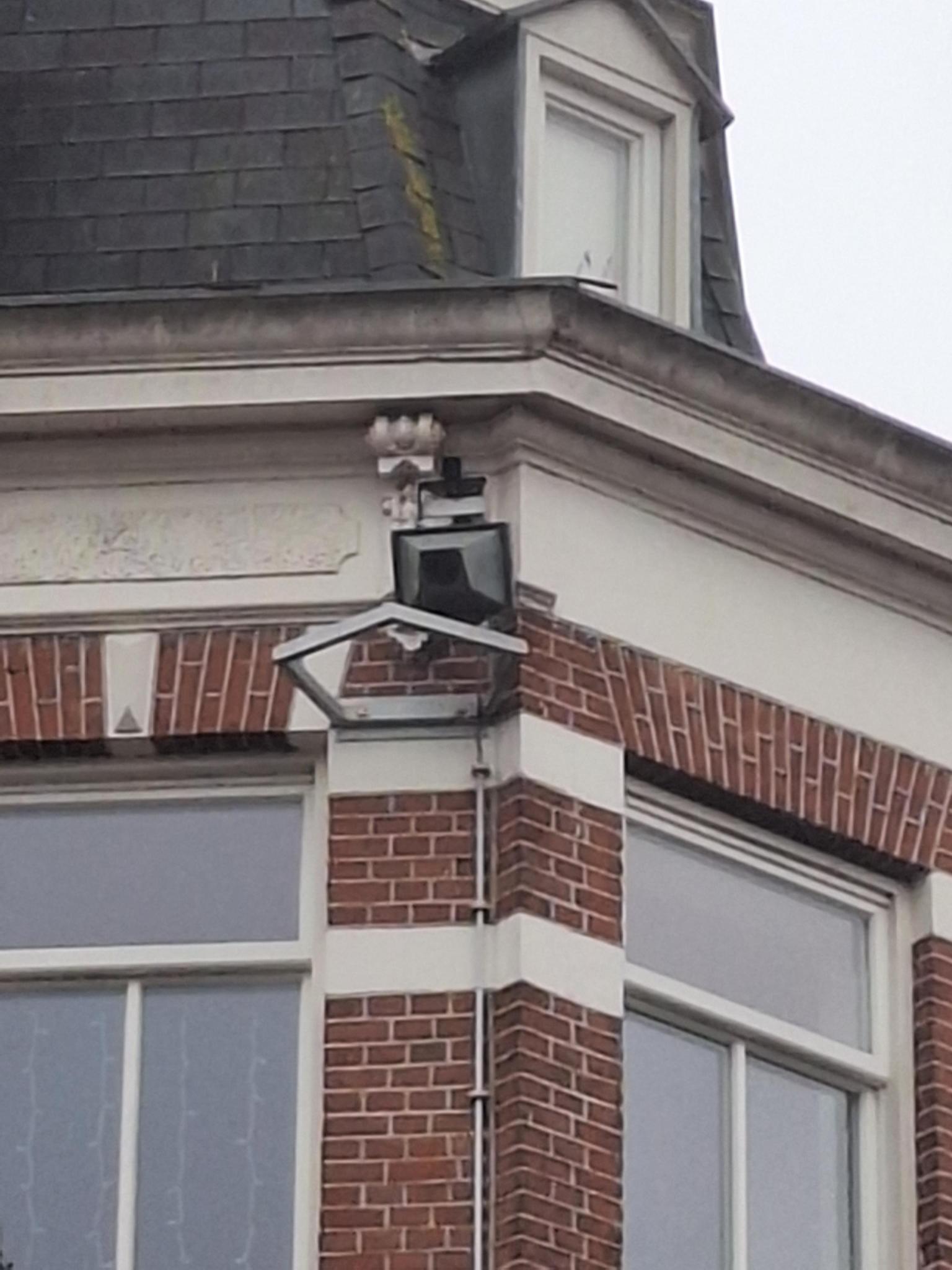 @douwe de ijzeren vijfhoeken lijken beschermingsdingen voor het apparaat erboven, zodat er niks langs kan glijden. Het apparaat erboven lijkt een PTZ camera met beschermkap… Maar het kan net zo goed een “total station” (met kap) zijn die ook gebruikt werden bij o.a. de noord zuid lijn, maar ook bij vele andere bouwprojecten om de positie van gebouwen te monitoren. Wat zit er aan de overkant van de straat? Zitten daar kleine zwarte reflectoren op de muur of “interessante” gebouwen?