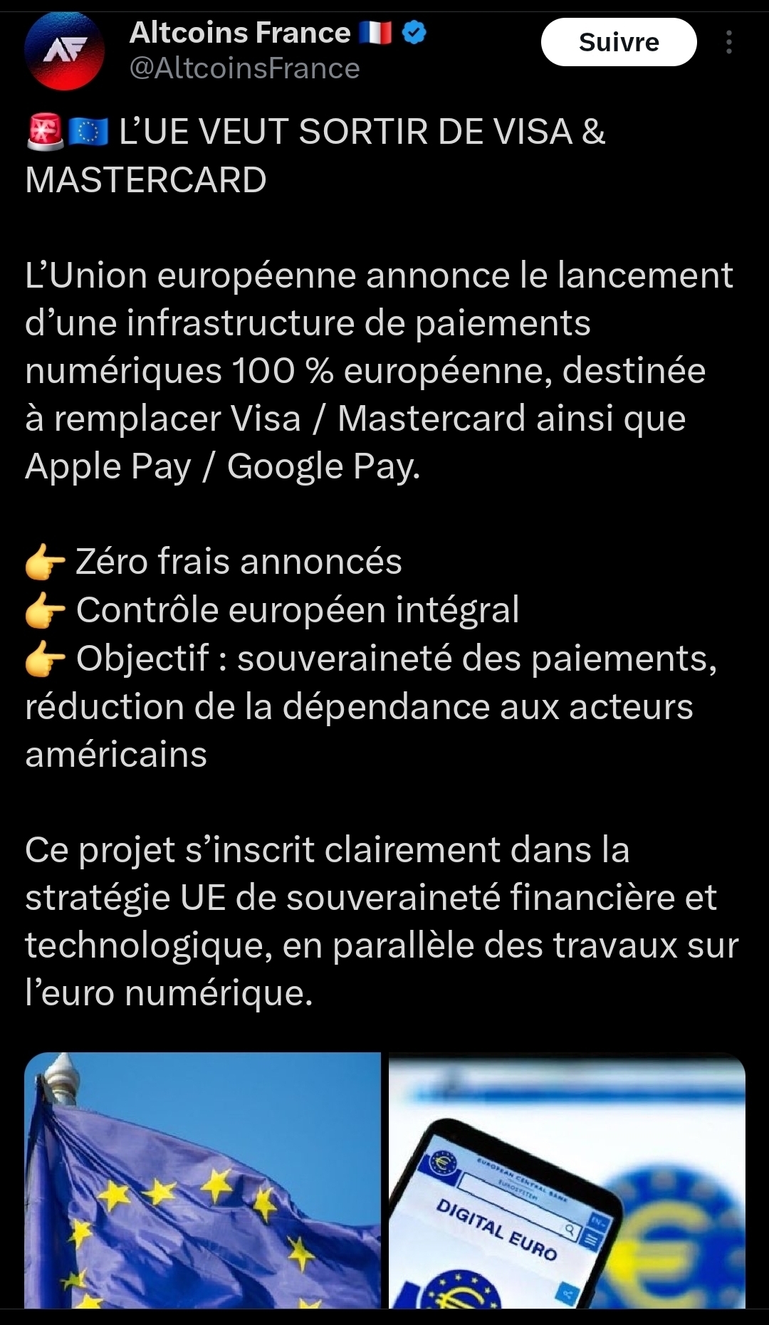 L' #UE souhaite(rait) créer rapidement l' #euro #numérique pour se passer de #Visa et #Mastercard #Digital #Euro x.com/i/status/200... investir.lesechos.fr/actu-des-val...
