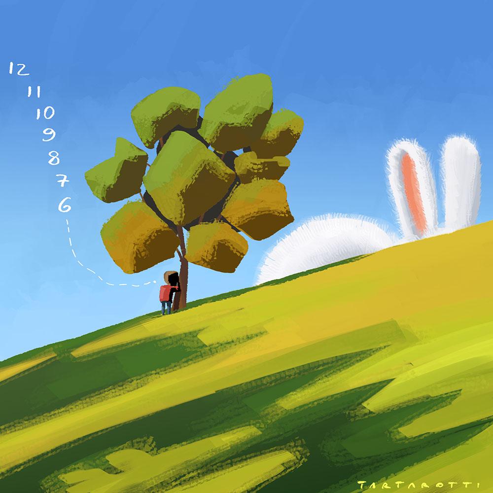 Gattoneromalvagio mi scrive "Tarta, calvo castagno, hai un disegno di un coniglio gigante che gioca a nascondino?"