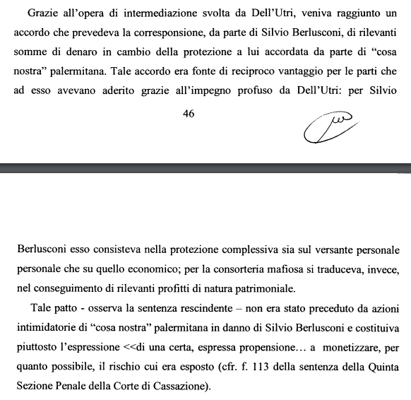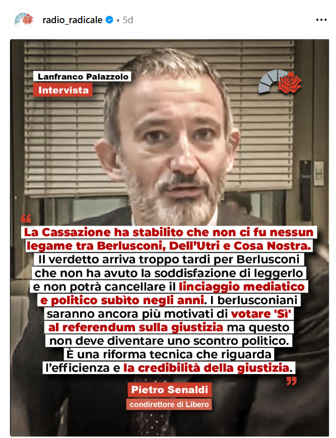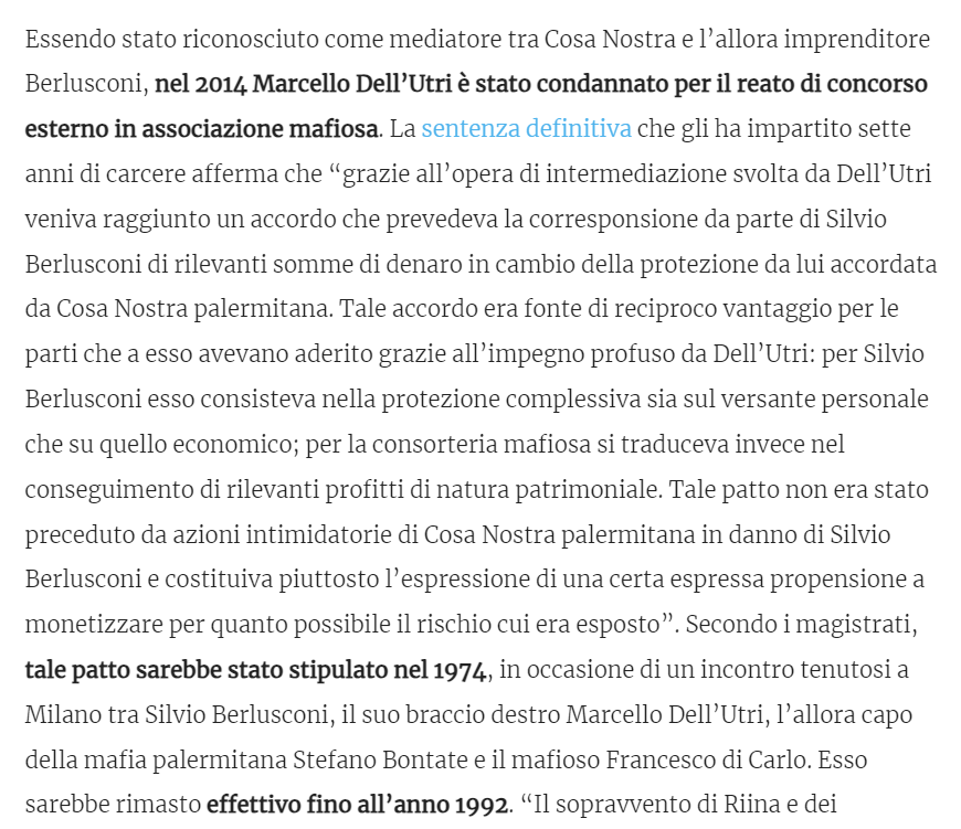 Pietro Senaldi, Radio Radicale e Lanfranco #Palazzolo riabilitano la storia di #Berlusconi e #Dellutri solo perché in un procedimento giudiziario la Cassazione ha stabilito che non è provato al di là di ogni ragionevole dubbio che l'eredità lasciata a Dell'Utri sia un premio per l'omertà che aveva spinto Berlusconi a definirlo "eroe". Ma in un'altra sentenza definitiva si stabilisce che Berlusconi tramite Dell'Utri ha finanziato Cosa Nostra per vantaggi e protezioni.