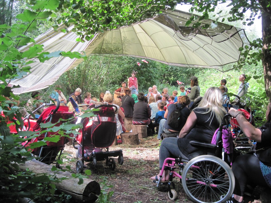 Community gathering outdoor under a large canopy, people listening to a man playing a guitar.