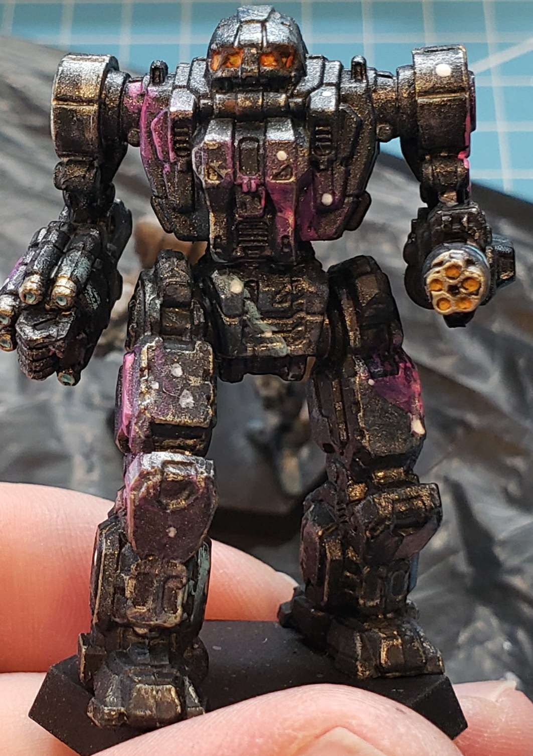 Finished model. Added highlights (battle damage paint wear-through) to the edges of panels; weapons glow to the rotary autocannon and the lasers, and cockpit instrument glow (basic- those windows are too small for me to do anything more exciting; I just don't have the manual dexterity for it).