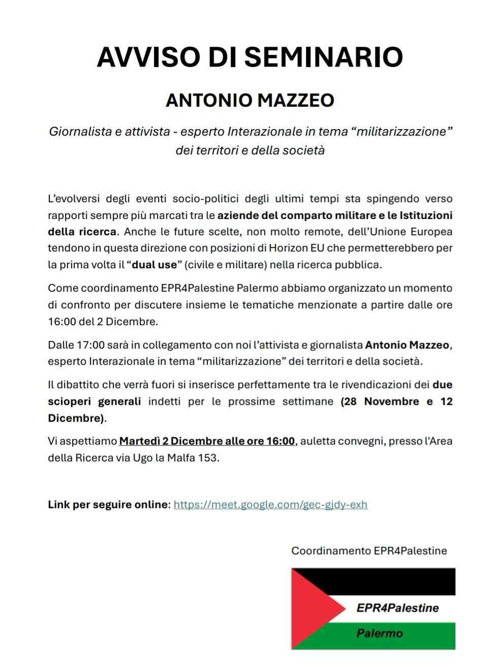 #nowar #norearm #Palermo, martedì 2 dicembre ore 16 - Istituto per la Ricerca e l'Innovazione Biomedica (IRIB) del #CNR