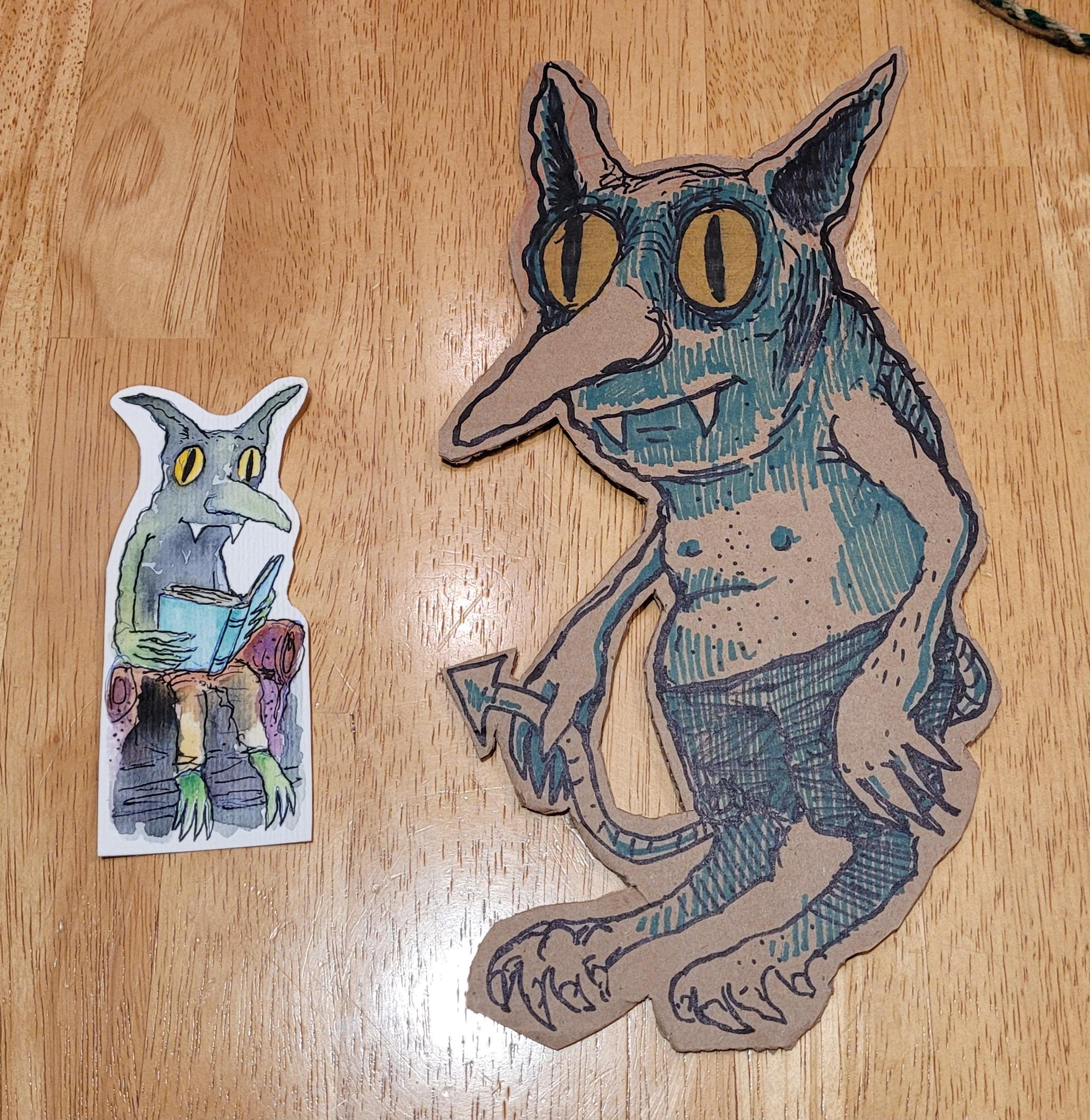 Happy ongoing Goblin Week! I made cardboard goblins with my family. Here's mine and also a little goblin bookmark to replace my watercolor flower bookmark, which was eaten (I'm not kidding).