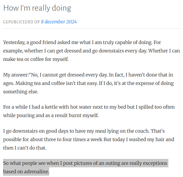How I’m really doing Gepubliceerd op 8 december 2024 Yesterday, a good friend asked me what I am truly capable of doing. For example, whether I can get dressed and go downstairs every day. Whether I can make tea or coffee for myself. My answer:“No, I cannot get dressed every day. In fact, I haven’t done that in ages. Making tea and coffee isn’t that easy. If I do, it’s at the expense of doing something else. For a while I had a kettle with hot water next to my bed but I spilled too often while pouring and as a result burnt myself. I go downstairs on good days to have my meal lying on the couch. That’s possible for about three to four times a week But today I washed my hair and then I can’t do that. So what people see when I post pictures of an outing are really exceptions based on adrenaline.