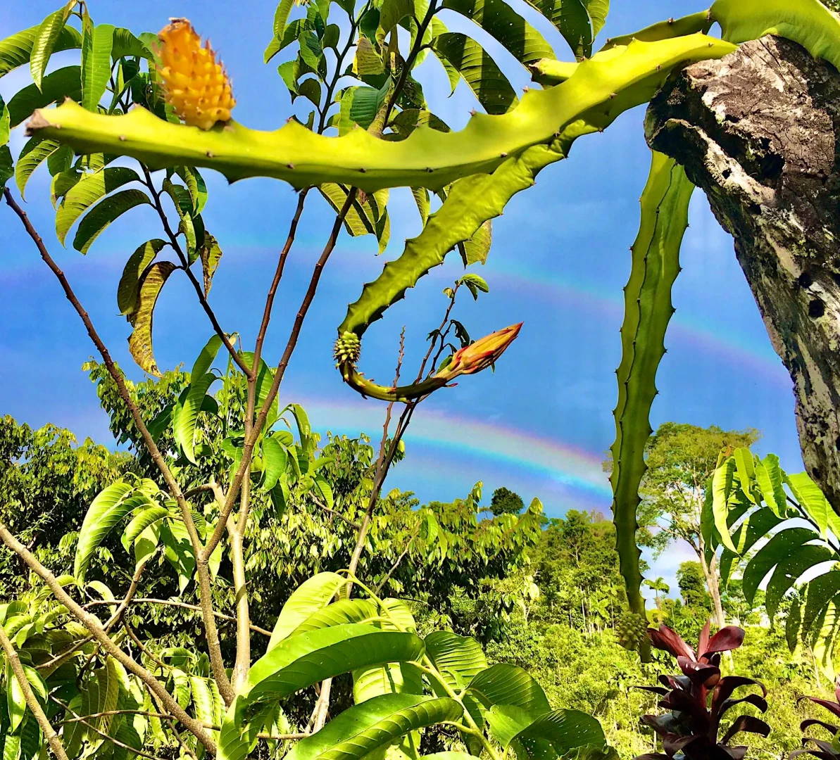 The hand-pollinated yellow pitahaya fruits are developing nicely. (The rainbows were a coincidence.)