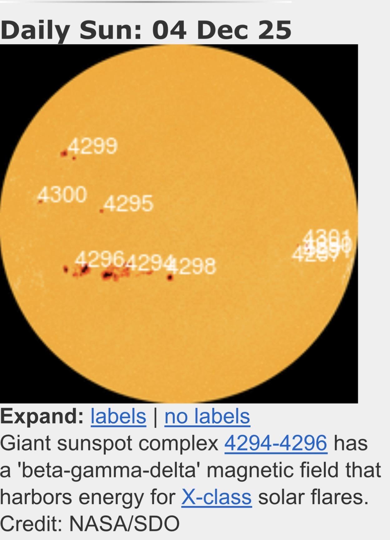 “Giant sunspot complex 4294-4296 has a 'beta-gamma-delta' magnetic field that harbors energy for X-class solar flares. Credit: NASA/SDO”