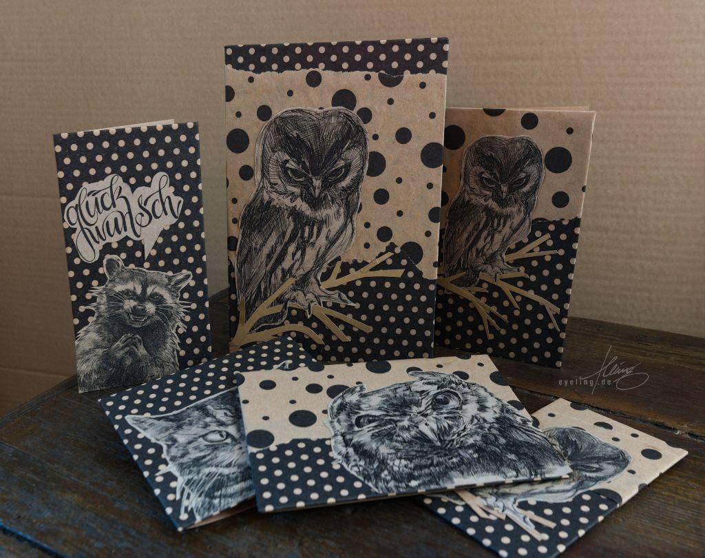 Some cards made from old animal meme drawings printed out on plain brown packaging paper and some old wrapping paper bought years ago. For sale at ComicCon Stuttgart later this month.