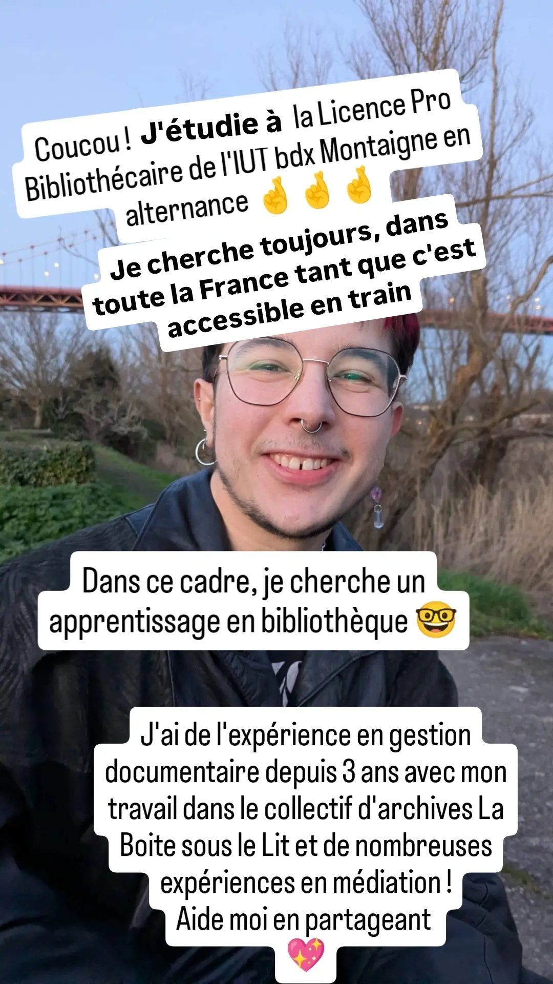 Une personne jeune portant des lunettes fait un sourire franc à la camera. Autour il est écrit "coucou j'étudie à la licence pro bibliothécaire de l'IUT Bordeaux Montaigne en alternance. Je cherche toujours dans toute la France tant que c'est accessible en train : dans ce cadre je cherche un apprentissage en bibliothèque. J'ai de l'expérience en gestion documentaire depuis 3 ans avec mon travail dans le collectif La Boîte sous le Lit et de nombreuses expériences en médiation ! Aide moi en partageant"