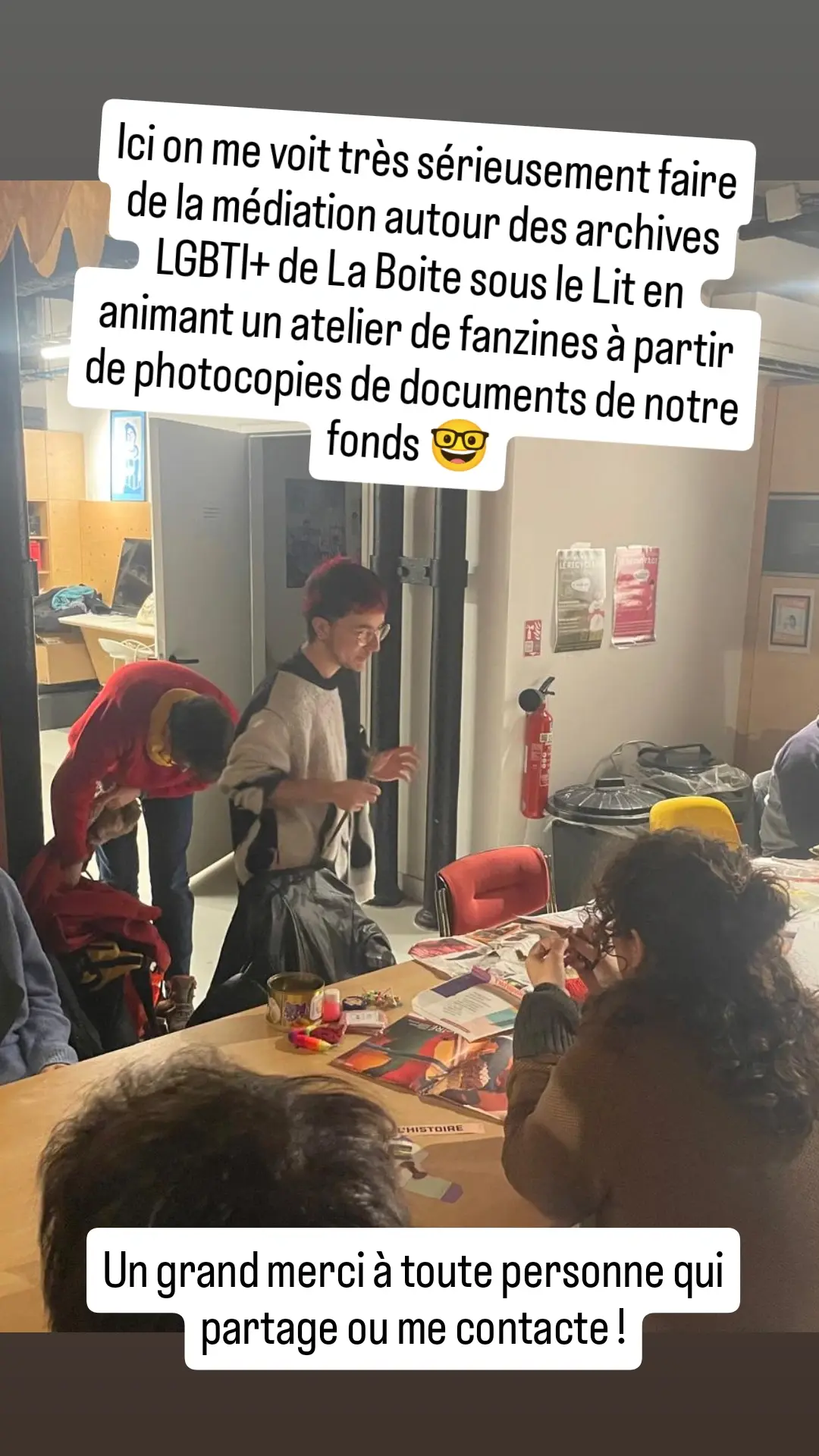 On voit des personnes assises et affairées autour d'une table sur laquelle sont posés des photocopiee et du matériel créatif. Devant la table on voit la personne de la première photo en train de parler avec enthousiasme, avec ses mains. Autour il est écrit "ici on le voit très sérieusement faire de la médiation autour des archives LGBTI+ de La Boîte sous le soit en animant un atelier de fanzines à partir de photocopies de documents de notre fonds"