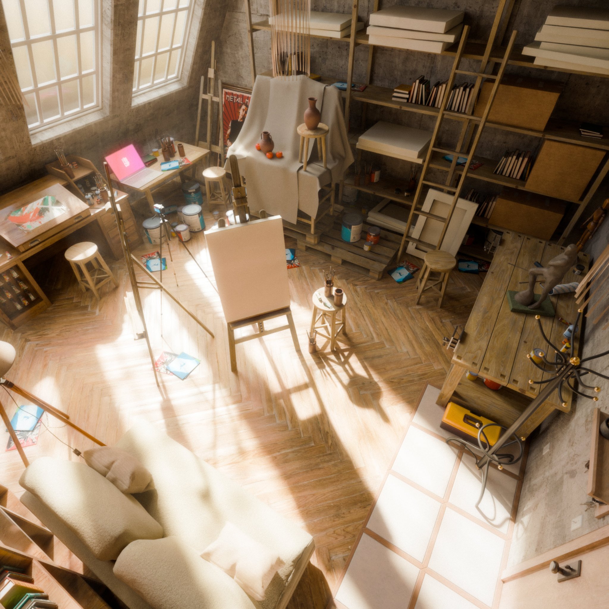 The image shows a cozy, sunlit artist’s studio filled with creative energy and a sense of organized chaos. Sunlight streams through tall, angled windows, casting warm patterns across the wooden herringbone floor. In the center stands a blank canvas on an easel, waiting to be painted. Around it are stools, brushes, sketchbooks, and scattered open art books. One corner features a still life setup draped in cloth with clay vases and fruit for study. Shelves line the back wall, stacked with books, canvases, jars of paint, and art supplies. A large drafting table with brushes and a pink laptop sits by the windows, while another workbench holds sculpting tools and a small clay figure. A soft beige couch with pillows rests in the foreground, offering a place to relax amid the clutter. The space feels alive with artistic process, a blend of messiness and inspiration, as though an artist has just stepped away mid-creation.
