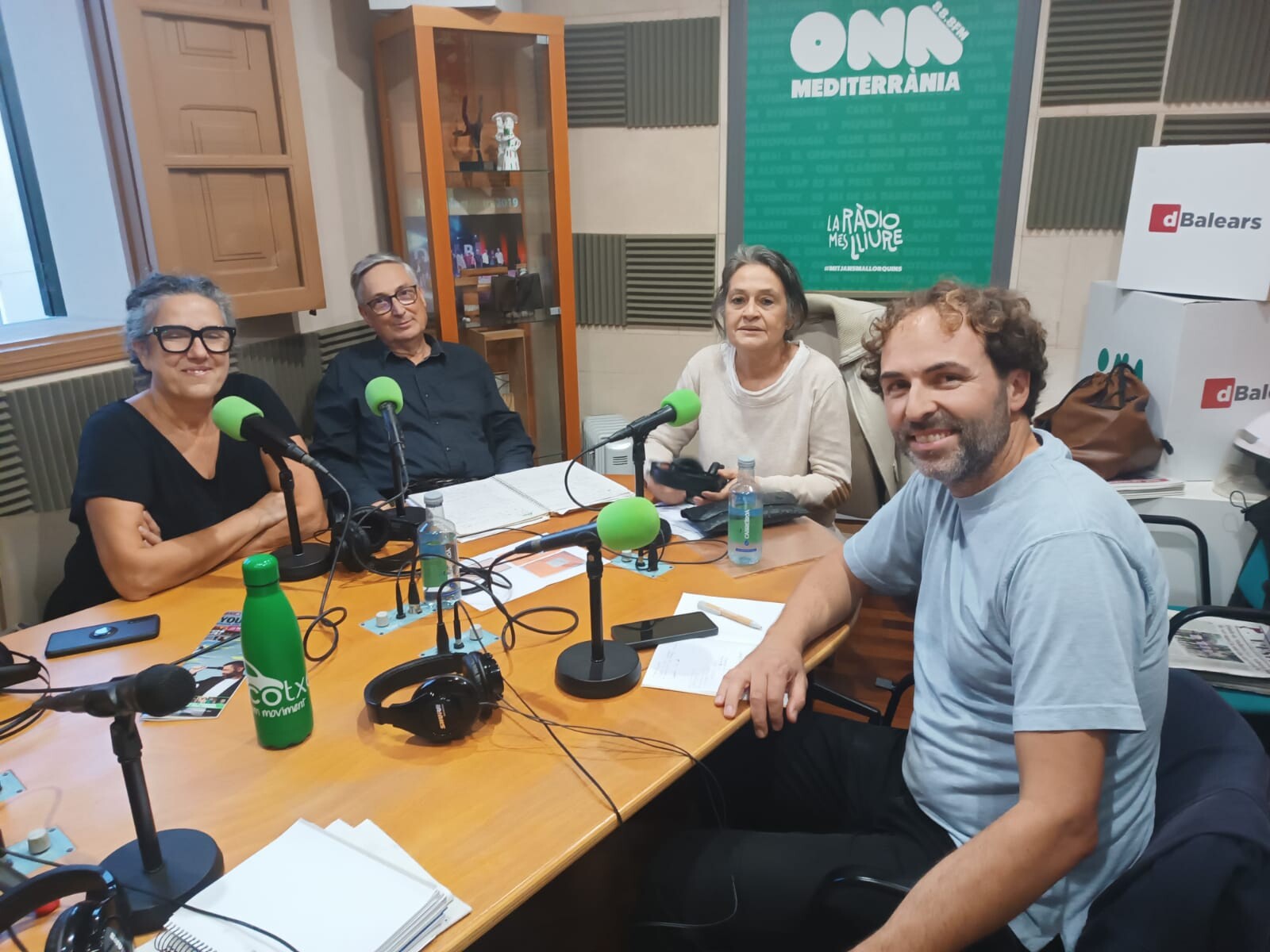 Jo a la dreta assegut davant d'un micròfon de ràdio verd. Altres persones de la taula són, d'esquerra a dreta, Xesca Martí, Ferran Navinés i Irene Salamanca. Al fons, a la paret, el logo d'Ona Mediterrània.