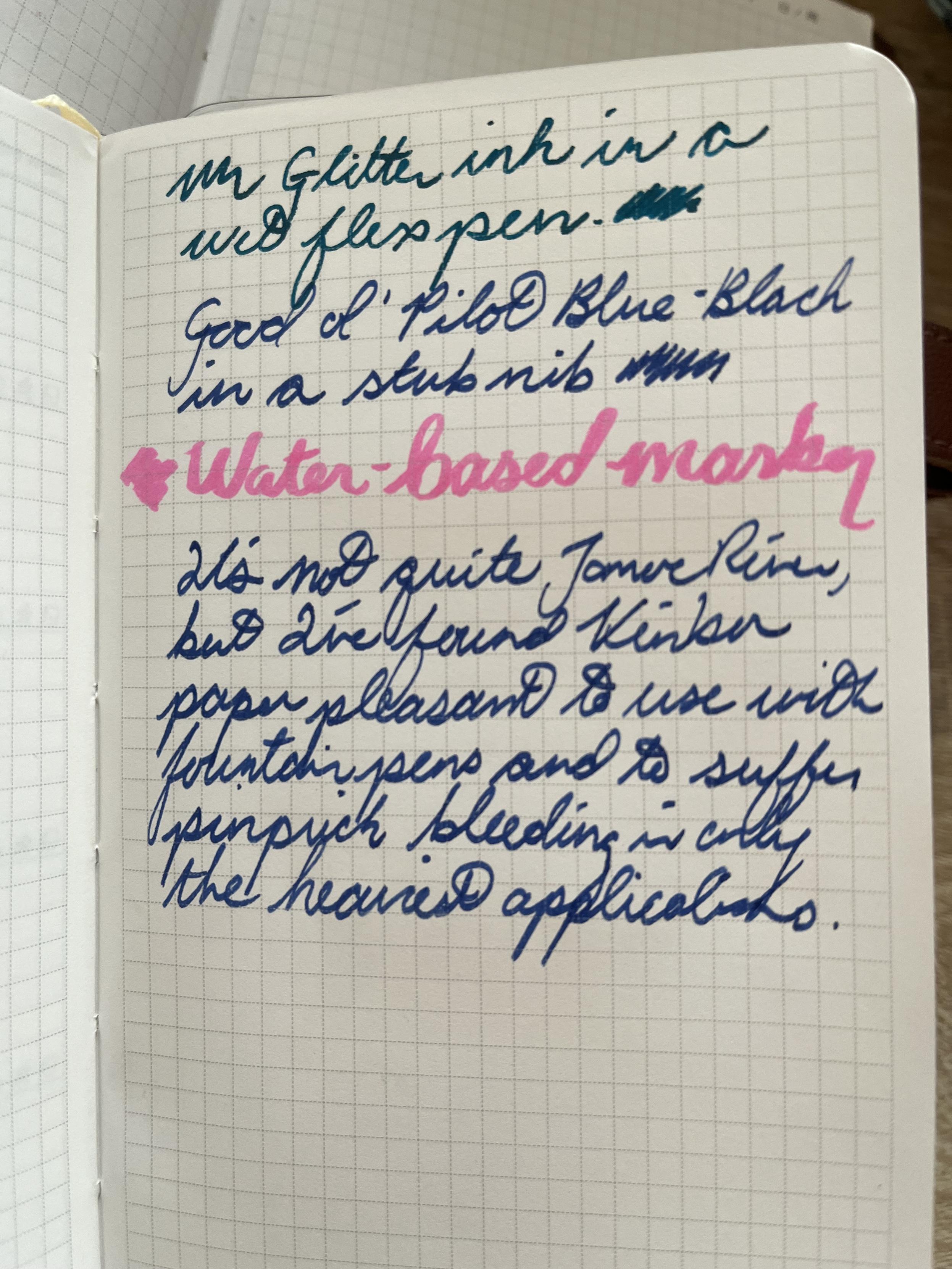 The paper is fountain-pen friendly. A very heavy, sheeny glitter ink in my wettest, flexy nib made a lot of pinprick bleeding, but a normal everyday writer ink in a wide stub nib didn't bleed at all, and there's no feathering. I have an undated daily A6 that I've been enjoying using as a scribbles book (the pictured purple cover was included) and just got a weekly for 2026.