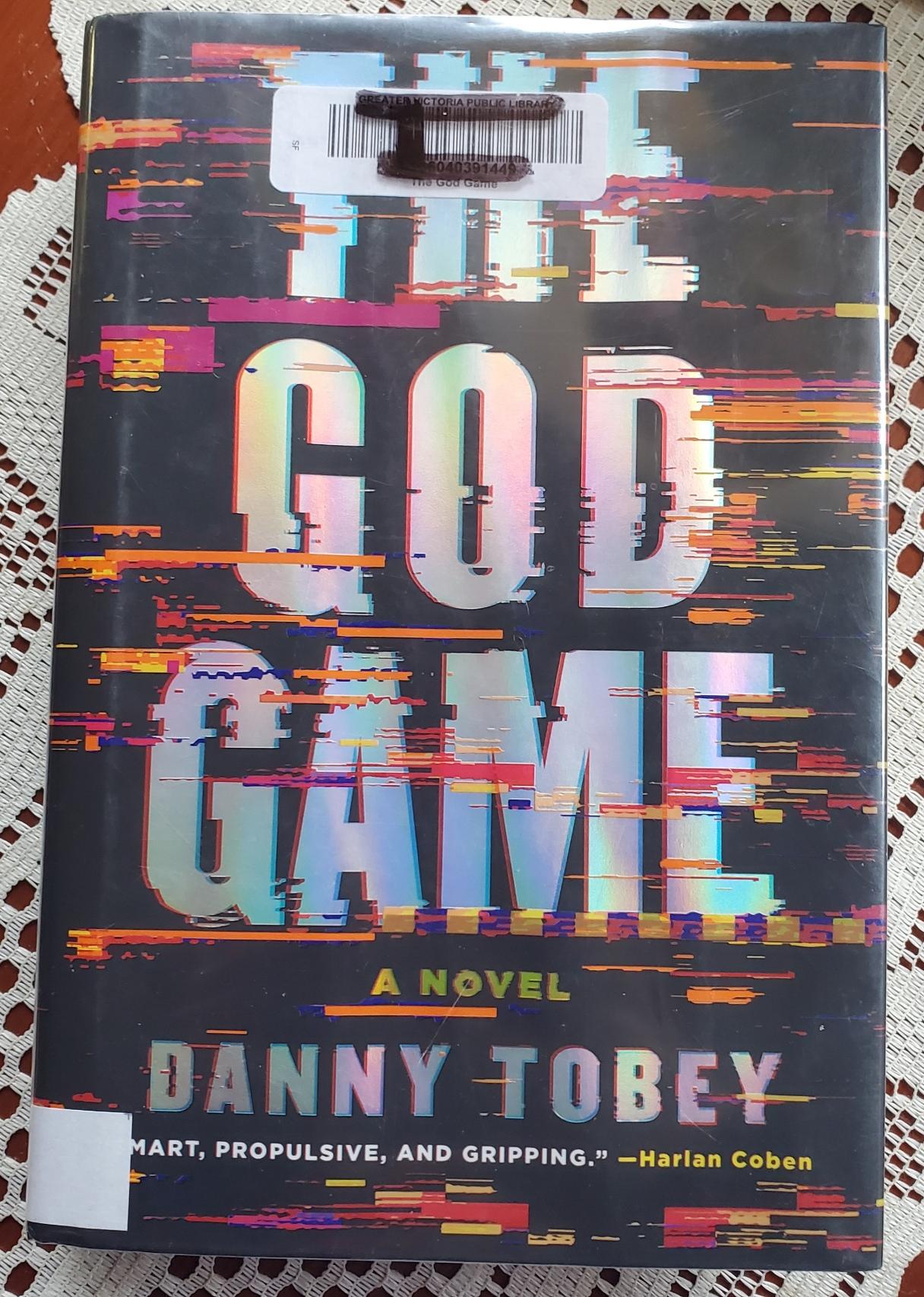 The cover of "The God Game," a novel by Danny Tobey, with text highlighted by pixelated color overlays. The title, "The God Game," appears in large, holographic letters. The author's name, "Danny Tobey," and the subtitle "A Novel" are below the title. A quote by Harlan Coben: "MART, PROPULSIVE, AND GRIPPING." is at the bottom of the cover. A library sticker is in the upper middle of the book.