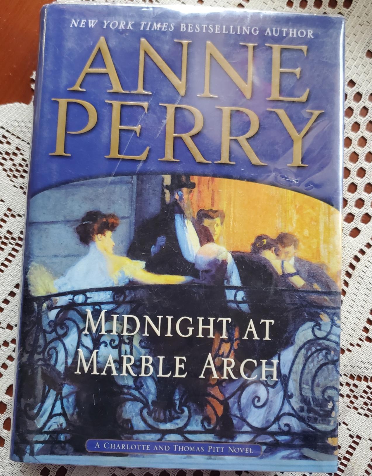 Book cover for "Midnight at Marble Arch" by Anne Perry, depicting a scene of figures on a balcony with a dark blue backdrop. The text at the top reads "NEW YORK TIMES BESTSELLING AUTHOR ANNE PERRY". Beneath the imagery, in large white letters, is the title "MIDNIGHT AT MARBLE ARCH" and below it "A CHARLOTTE AND THOMAS PITT NOVEL" appears in a small blue banner.