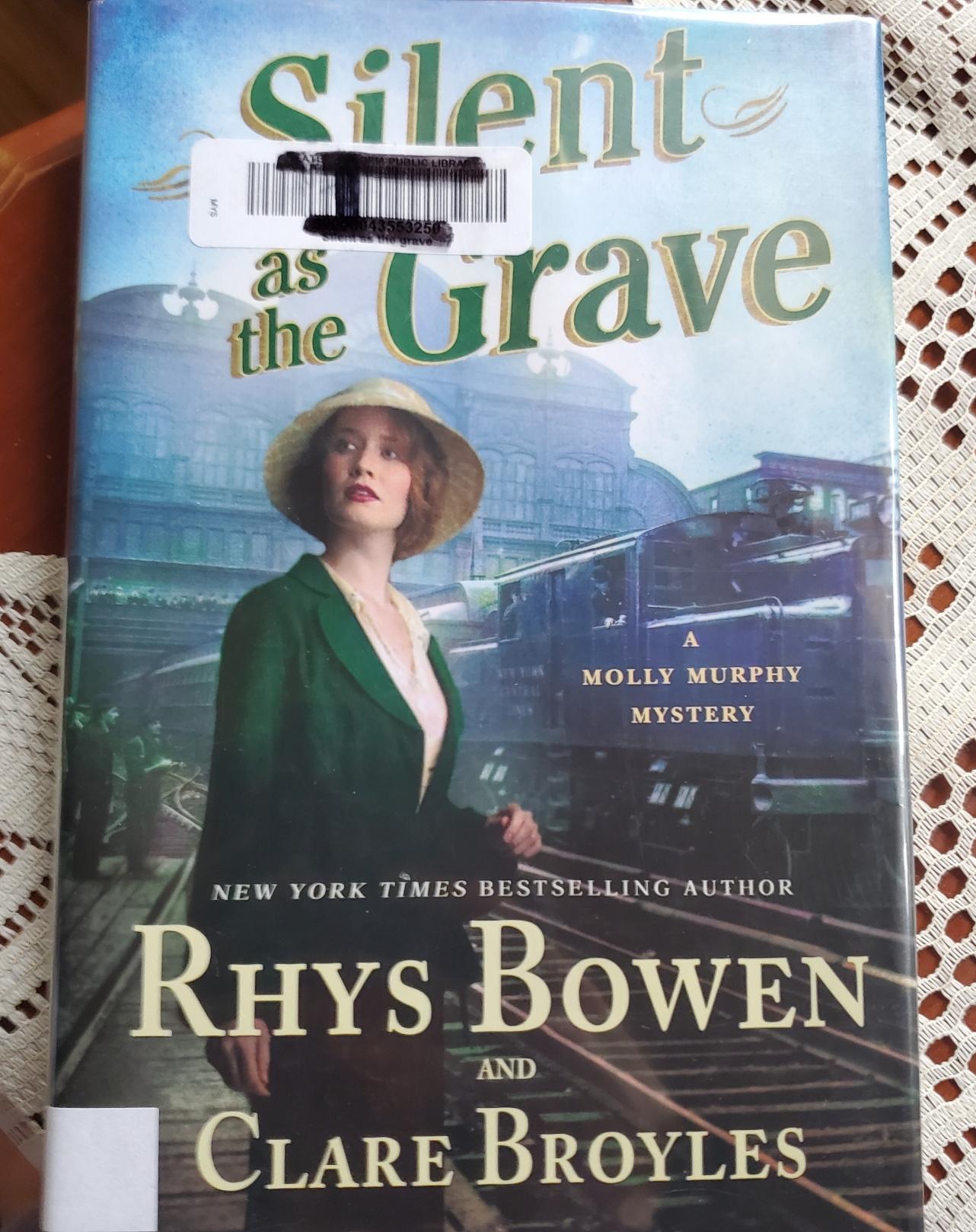 Cover of the book "Silent as the Grave: A Molly Murphy Mystery" by Rhys Bowen and Clare Broyles. The cover features a woman in a green jacket and hat in front of a blue train, with the title "Silent as the Grave" at the top and "A Molly Murphy Mystery" below the train. The barcode and library sticker are partially covering the top title.