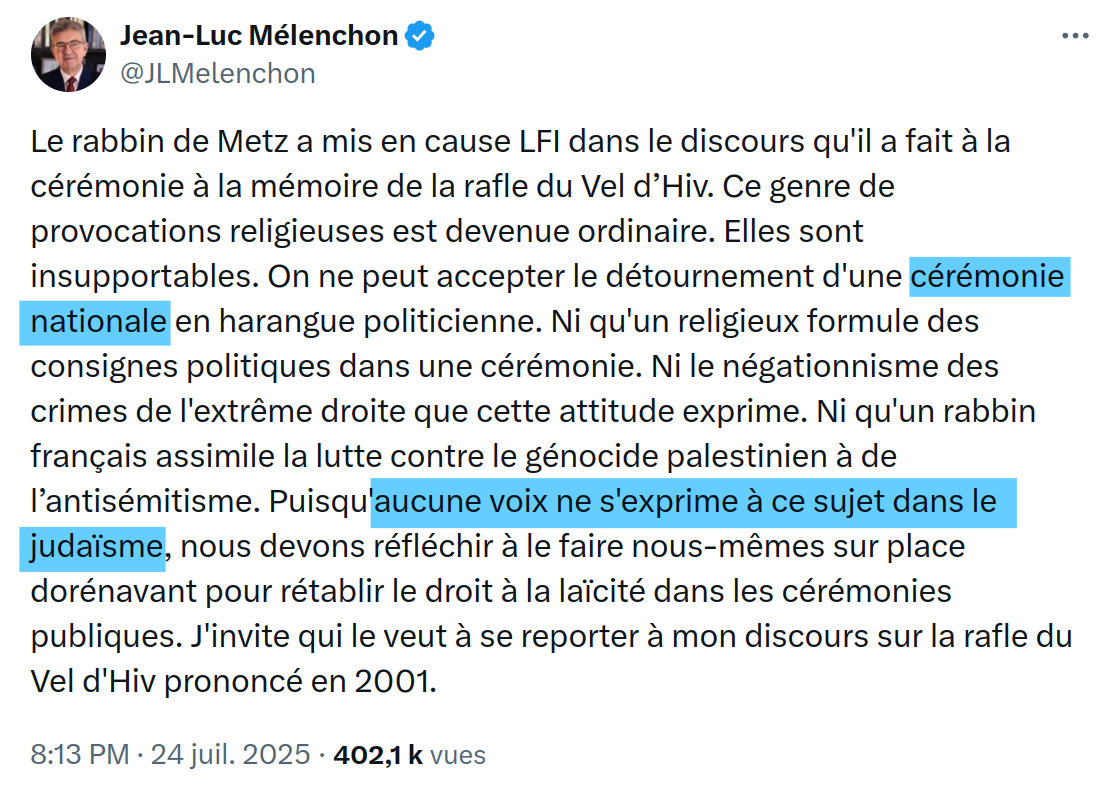 Pour le lol, est-ce que selon Mélenchon, la rafle du Vel d'Hiv, c'est la France ou pas ?