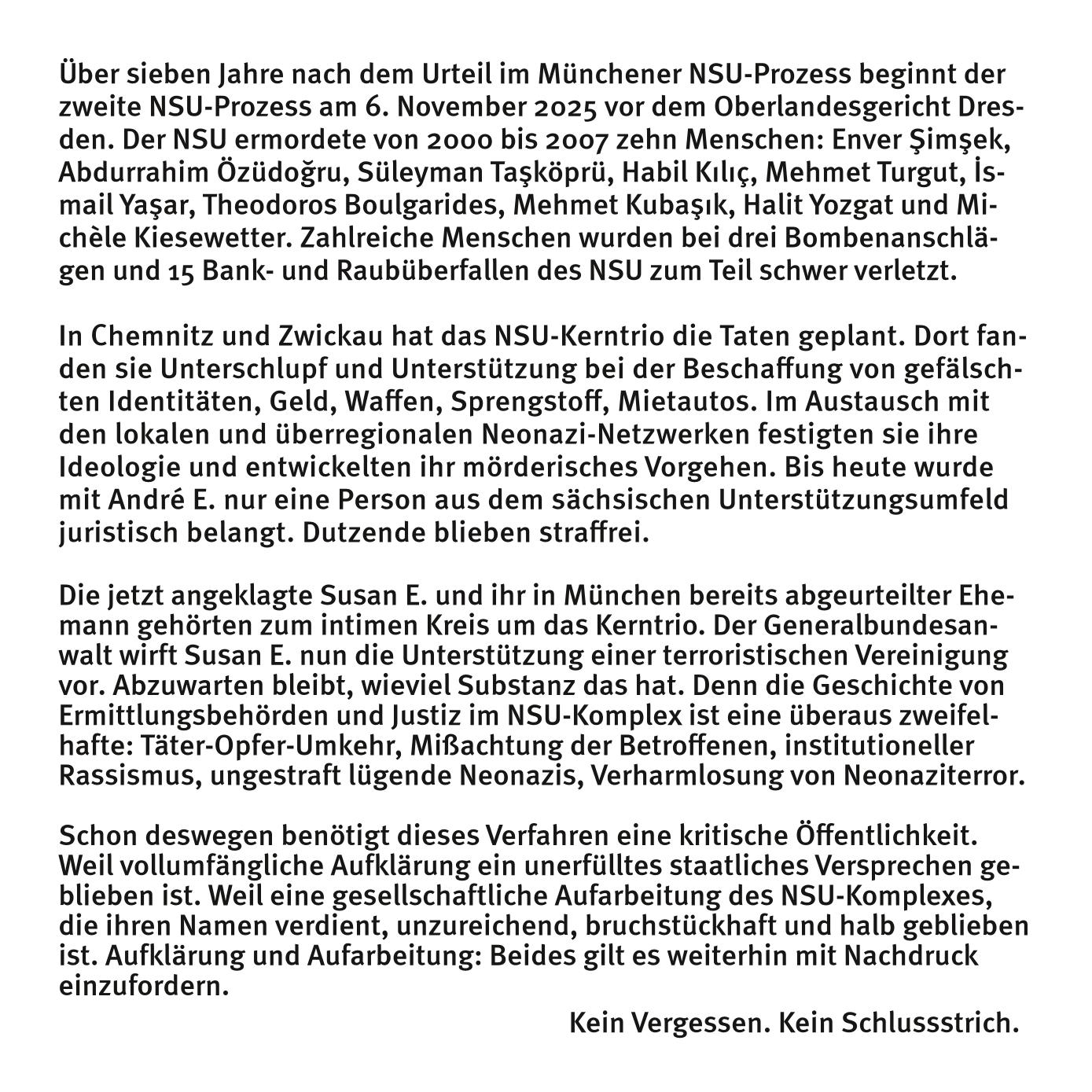 Über sieben Jahre nach dem Urteil im Münchener NSU-Prozess beginnt der zweite NSU-Prozess am 6. November 2025 diesmal vor dem Oberlandesgericht Dresden. Der NSU ermordete von 2000 bis 2007 zehn Menschen: Enver Şimşek, Abdurrahim Özüdoğru, Süleyman Taşköprü, Habil Kılıç, Mehmet Turgut, İsmail Yaşar, Theodoros Boulgarides, Mehmet Kubaşık, Halit Yozgat und Michèle Kiesewetter. Zahlreiche Menschen wurden bei drei Bombenanschlägen und 15 Bank- und Raubüberfallen des NSU zum Teil schwer verletzt.