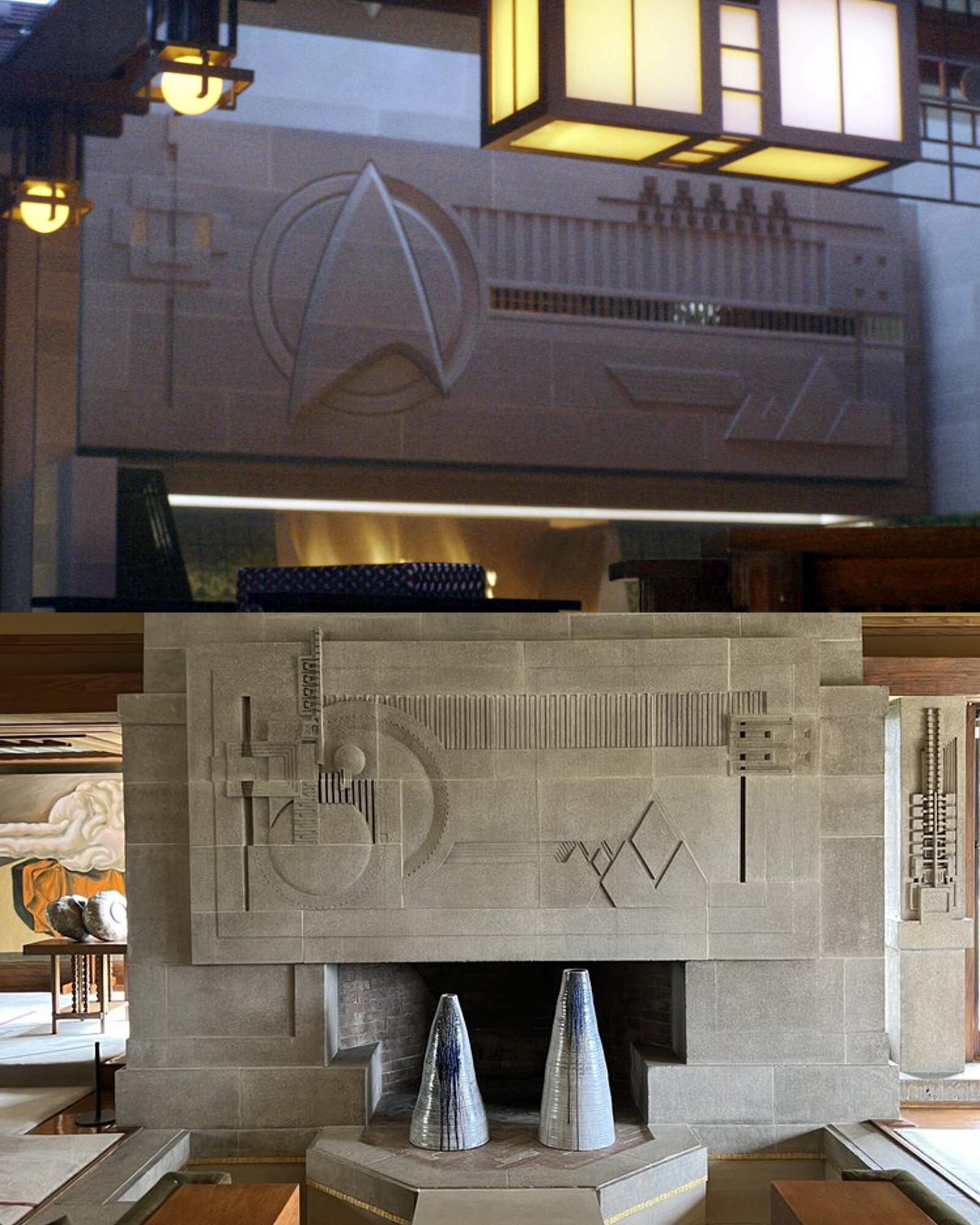 Big thanks to everybody who let me know that the stone panel above Nahla Ake'ss office fireplace in #StarfleetAcademy⬆️ is based on the fireplace in Frank Lloyd Wright's Hollyhock House ⬇️. This is not the first time that Frank Lloyd Wright has been visually quoted on #StarTrek like that: 🧵 1/3