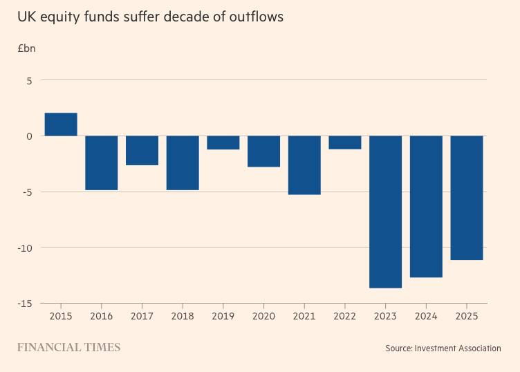 UK equity funds suffer decade of outflows, £bn Shows outflows every year since 2016 but until 2022 oscillating between £0.25bn & £1bn a year... for the last three years (since 2023) outflows have been above £10bn a year