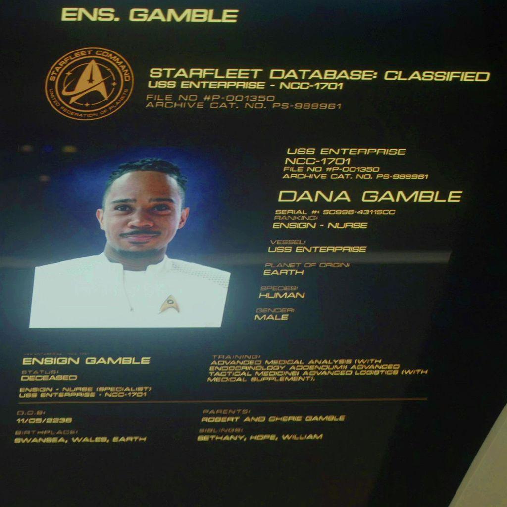 Ensign/Nurse Dana Gamble's medical file in #StarTrekSNW's "New Life and New Civilizations" reveals that he's Welsh, the name of his parents and his siblings, among other details.