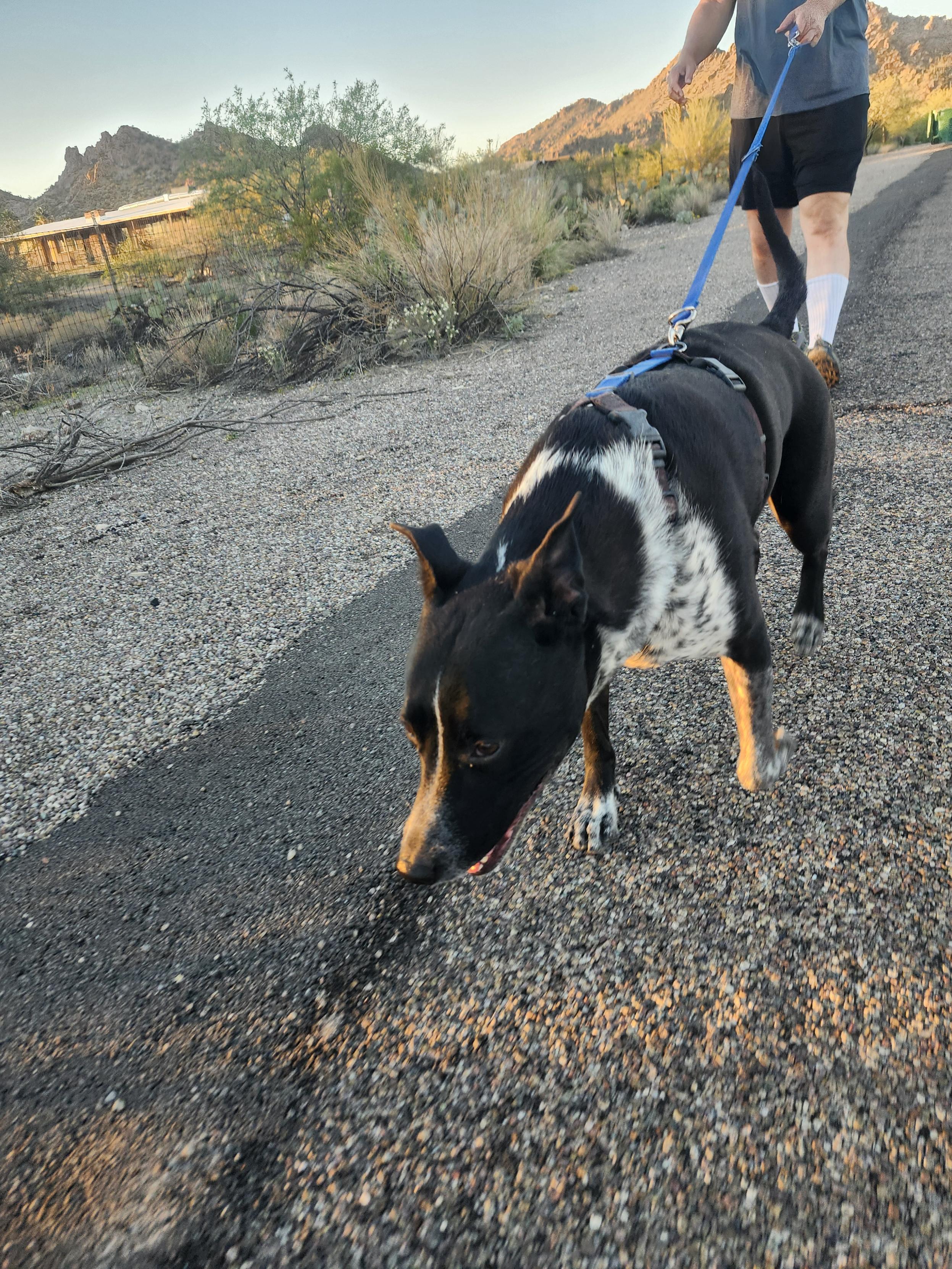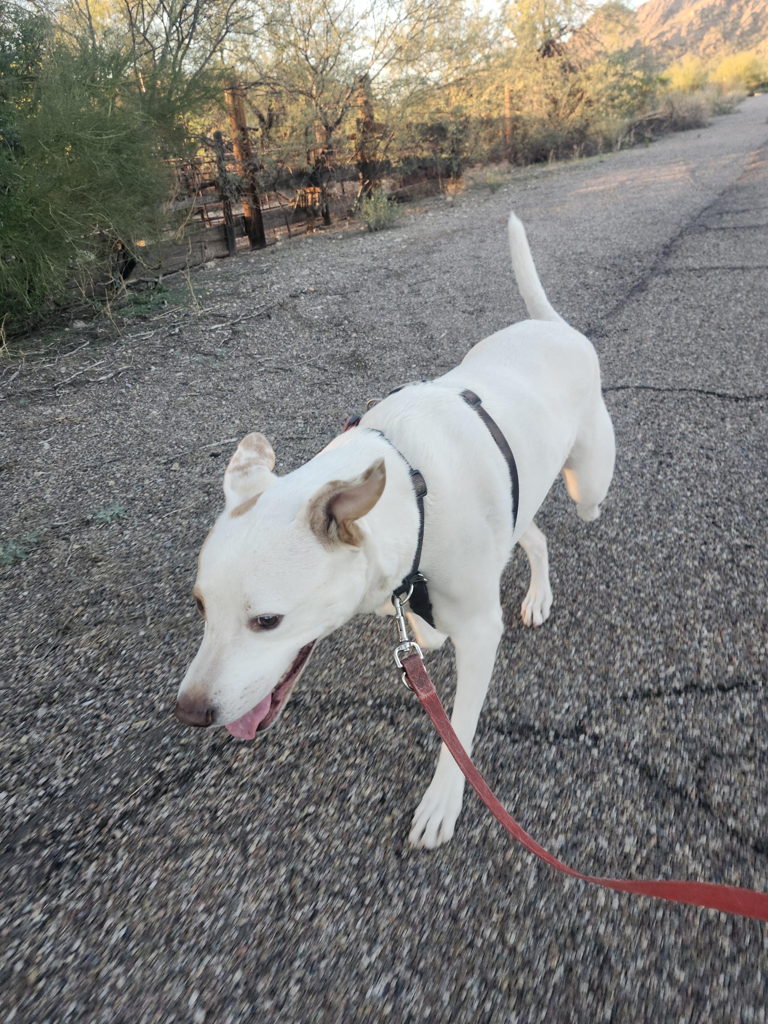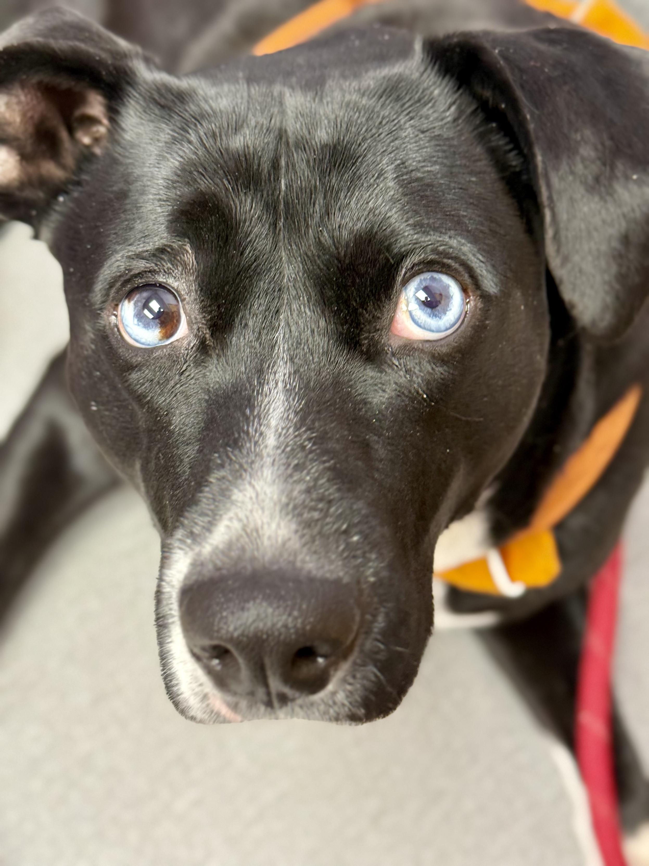 Bubbles the dog, wearing an orange harness and looking anxiously up at the camera.