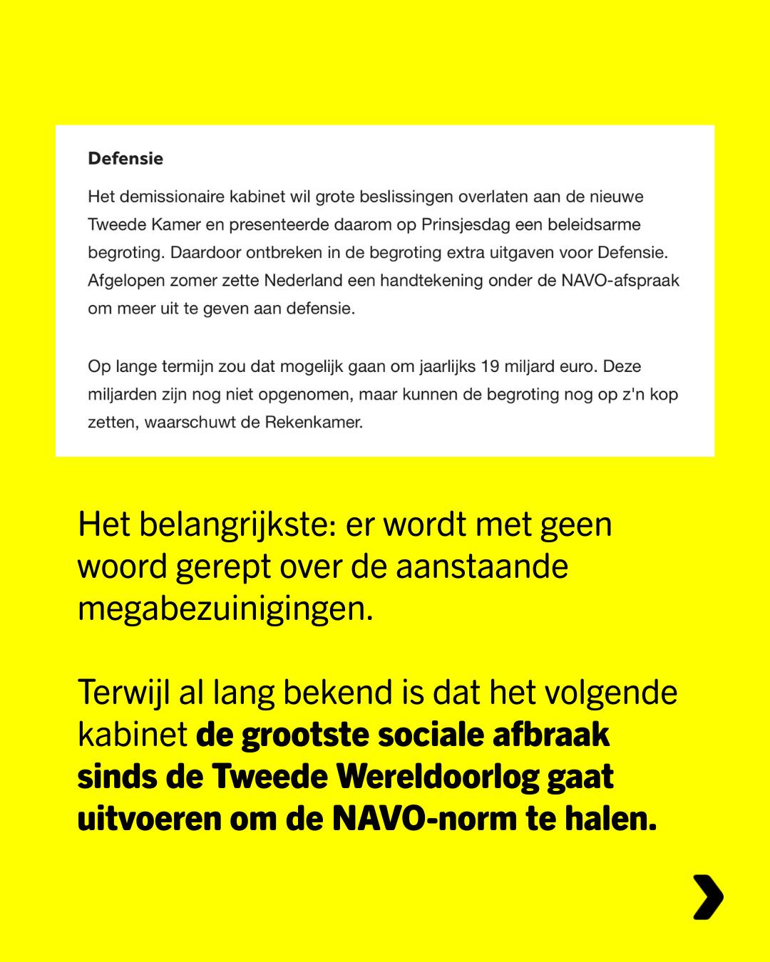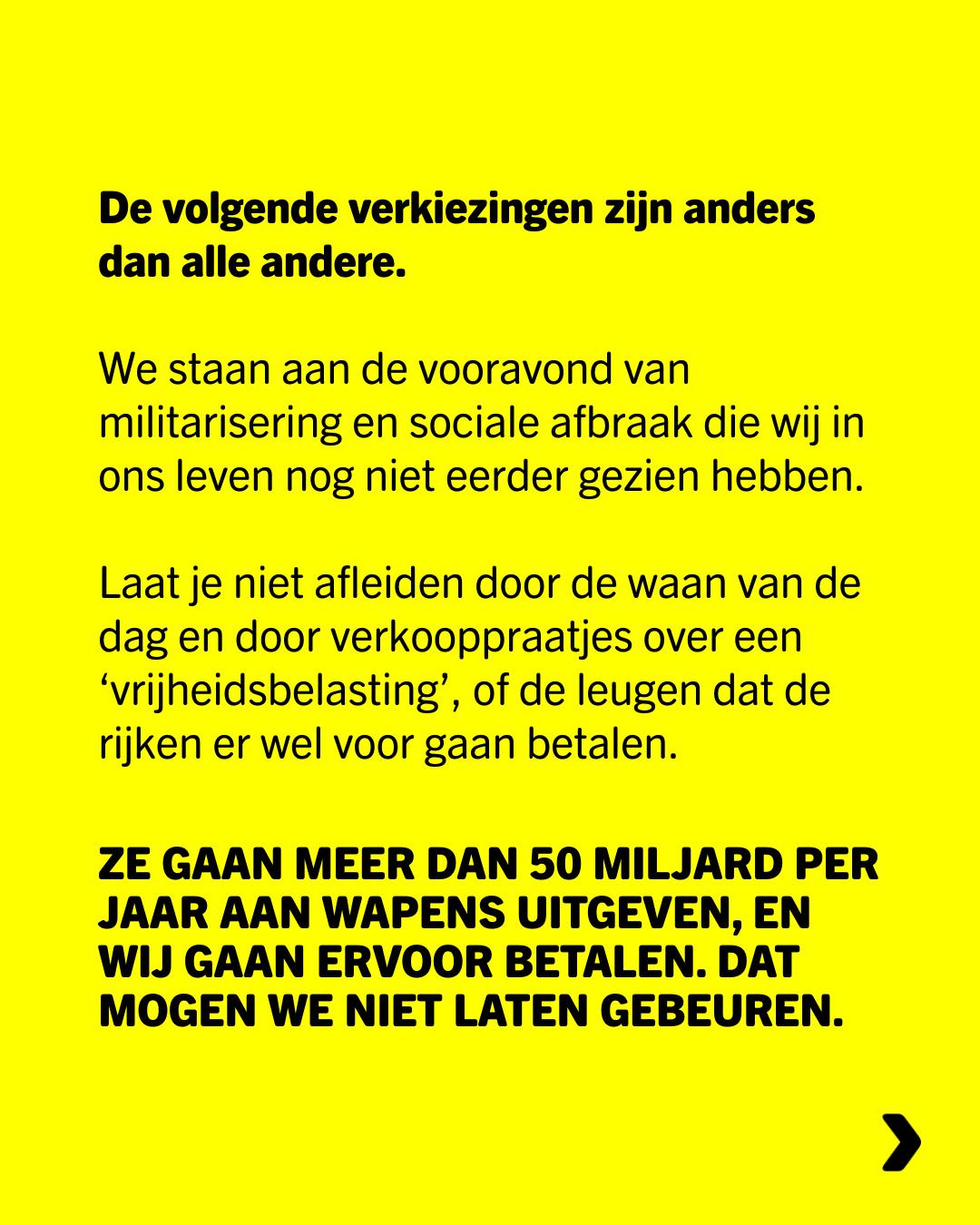 We staan aan de vooravond van #militarisering en sociale afbraak die wij in ons leven nog niet eerder gezien hebben. Laat je niet afleiden door de waan van de dag en door verkooppraatjes over een 'vrijheidsbelasting', of de leugen dat de rijken er wel voor gaan betalen.
