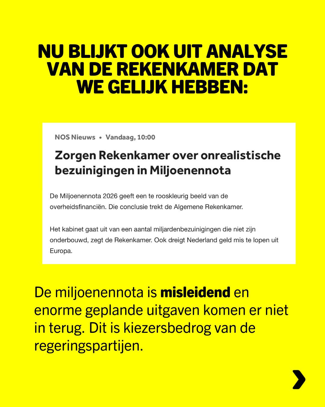 De miljoenennota is misleidend en enorme geplande uitgaven komen er niet in terug. Dit is kiezersbedrog van de regeringspartijen.