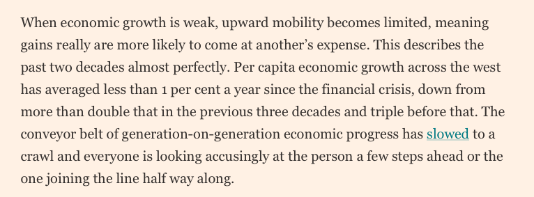 When economic growth is weak, upward mobility becomes limited, meaning gains really are more likely to come at another’s expense. This describes the past two decades almost perfectly. Per capita economic growth across the west has averaged less than 1 per cent a year since the financial crisis, down from more than double that in the previous three decades and triple before that. The conveyor belt of generation-on-generation economic progress has slowed to a crawl and everyone is looking accusingly at the person a few steps ahead or the one joining the line half way along.
