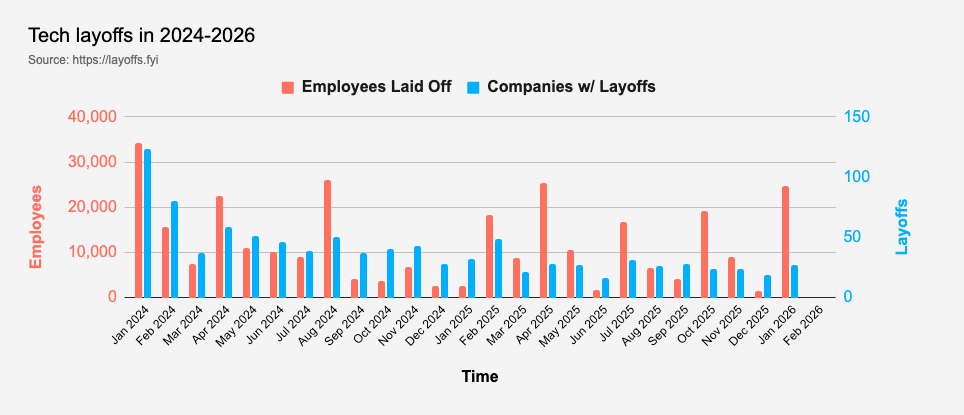 Looking at https://layoffs.fyi, 25,000 tech employees have been laid off this year already.