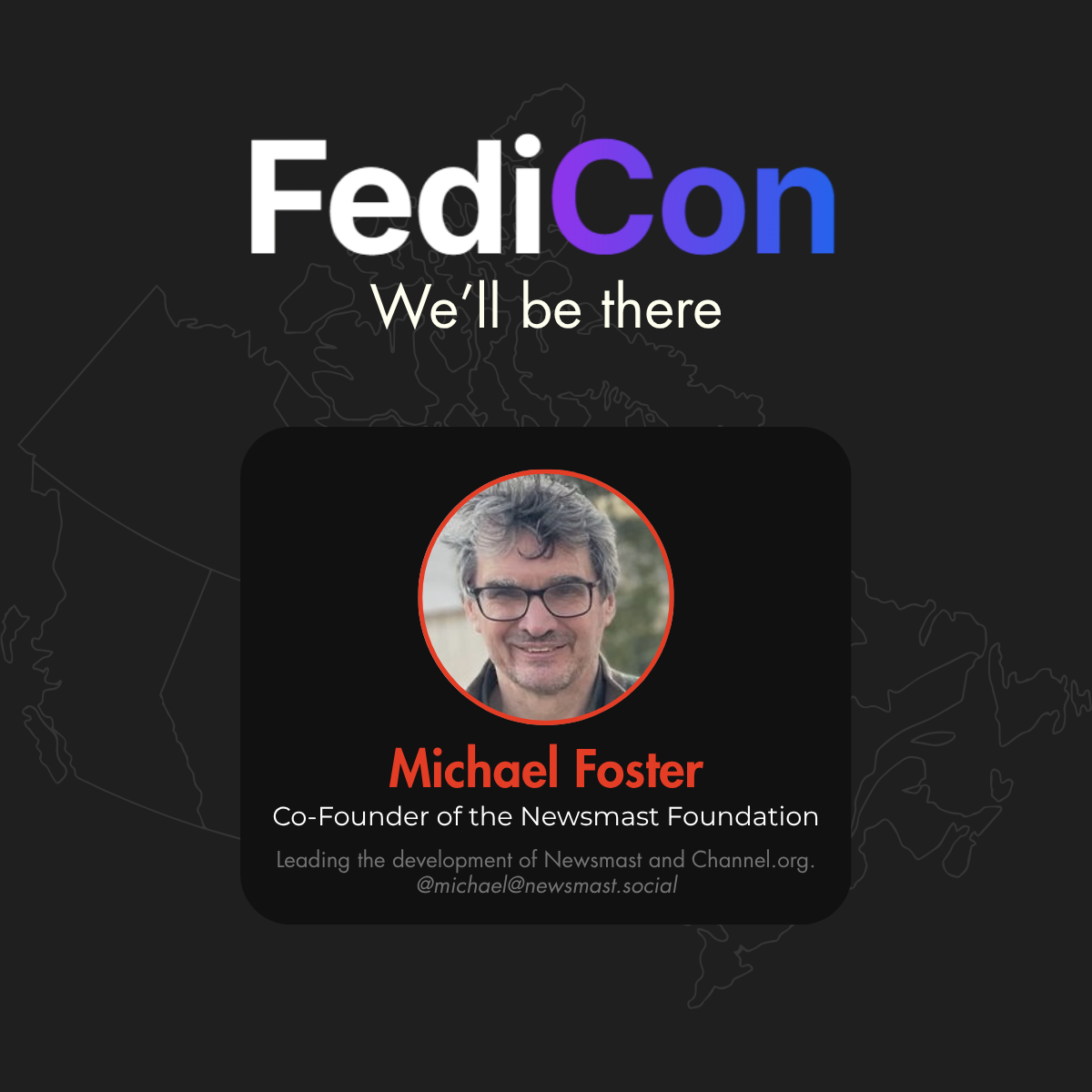 An image showing Michael's profile picture and some information about his exploits over a background depicting the nation of Canada. It reads: FediCon. We'll be there. Michael Foster. Co-Founder of the Newsmast Foundation. Leading the development of Newsmast and Channel.org. @michael@newsmast.social.