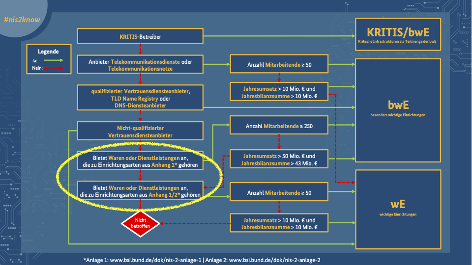 Ein Entscheidungsbaum der verschieden Sektoren Abfragt. Wenn man innerhalb des Sektors arbeitet, wird die Unternehmensgröße abgefragt und bei > 250 MA landet be besonders wichtige Einrichtung Gelb umkringelt sind die "Bietet Waren oder Dienstleistungen an, die zu Einrichtungsarten aus Anhang 1/2 gehören"