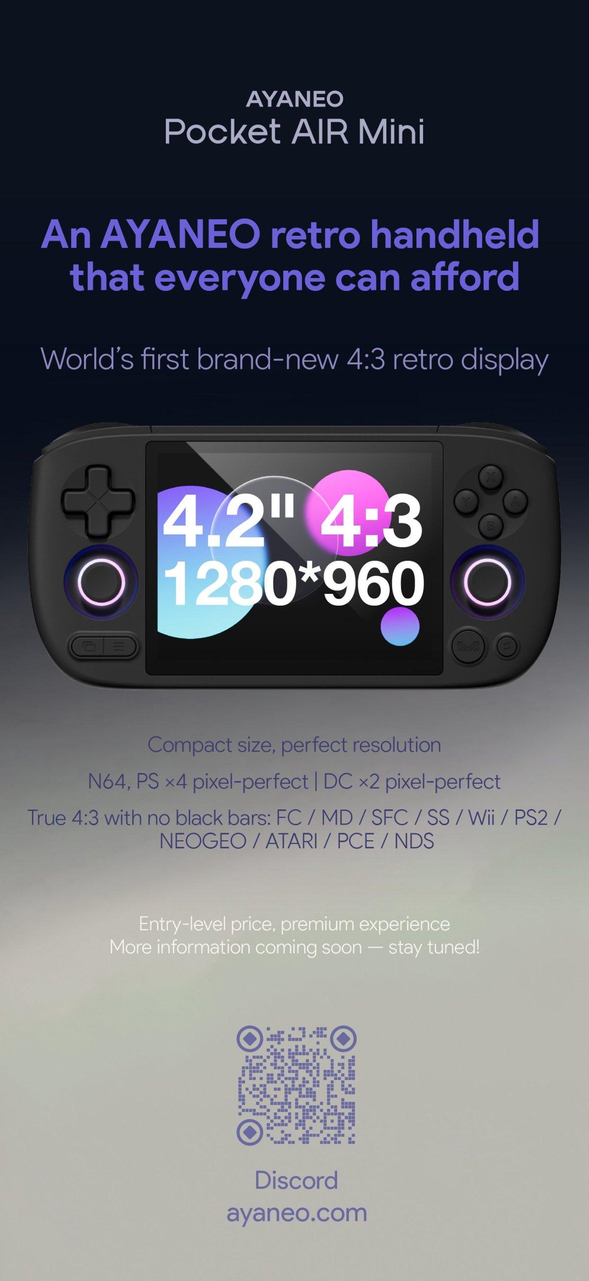 AYANEO Pocket AIR Mini will be an entry-level Android handheld with a 4.2 inch, 1280 x 960, 4:3 display, RGB backlit analog sticks, and enough performance for N64, PS, and Dreamcast games. #AYANEOPocketAIRMini#HandheldGameConsole