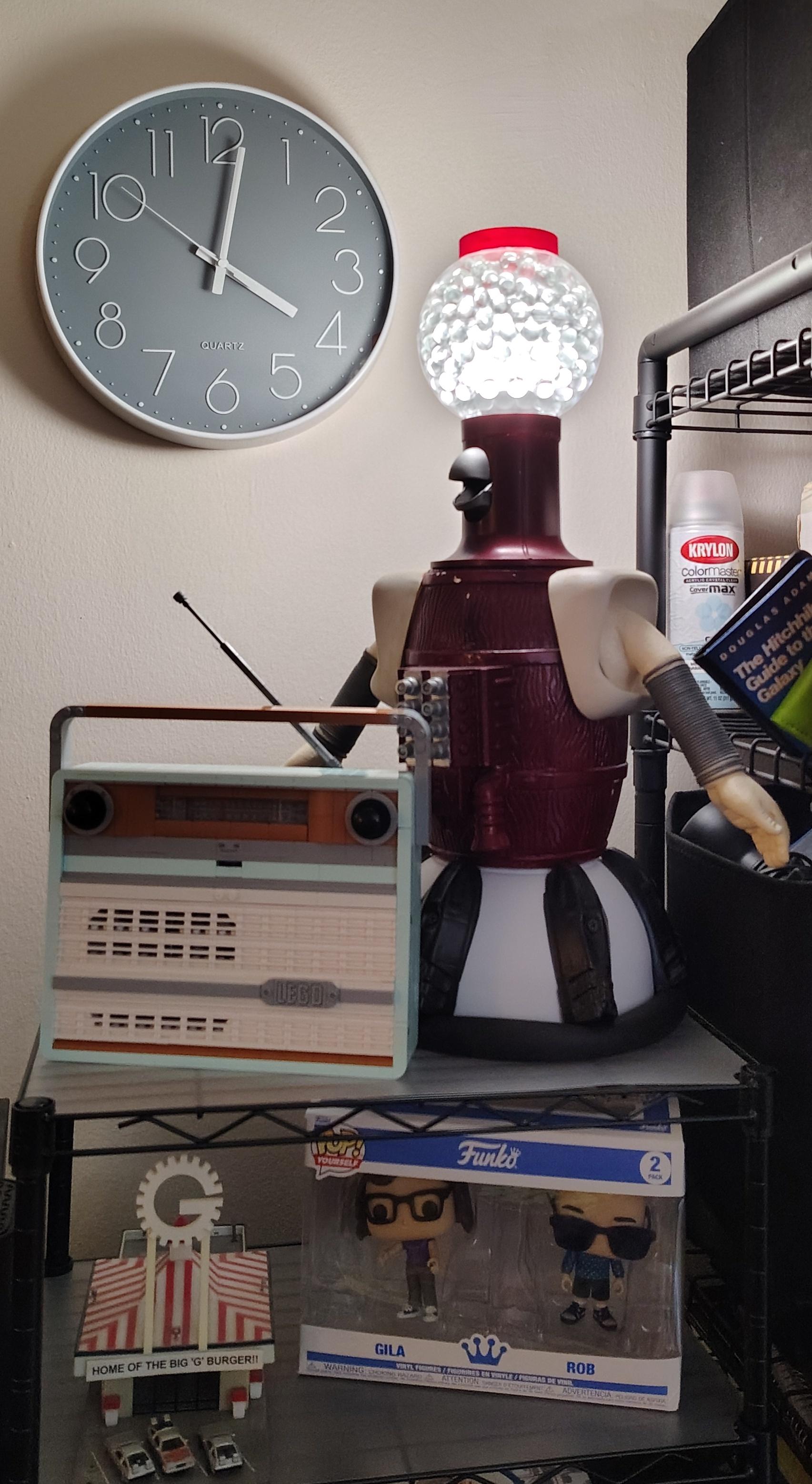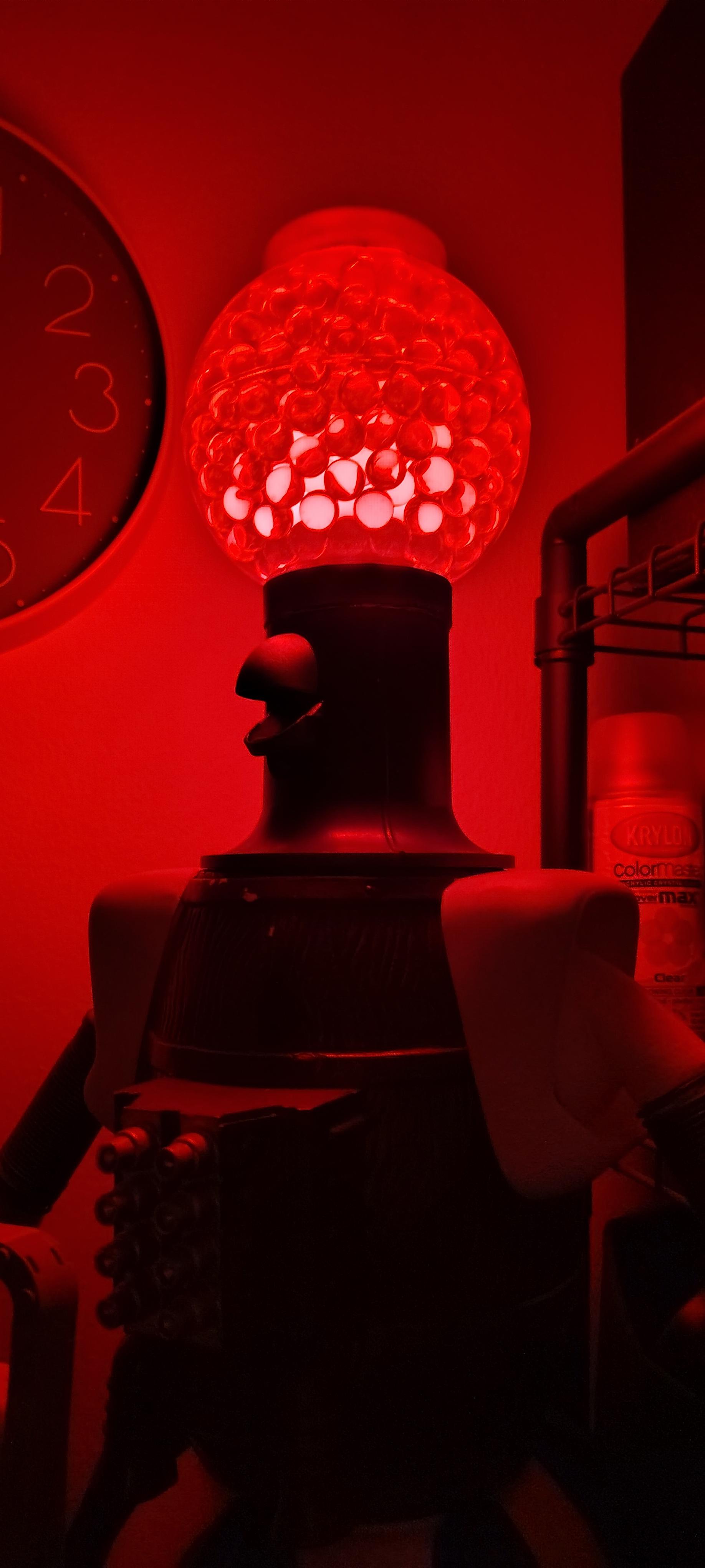 I had a puppet replica of Tom Servo from MST3K which I built over 20 years ago. After many years and lots of knocking around, the poor guy had worn out a lot. I replaced some old parts, stripped out the puppetry mechanisms, wired him up as a lamp, and added a color-changing smart bulb and some glass marbles for diffusion. Now he's the sassiest light source in the house!
