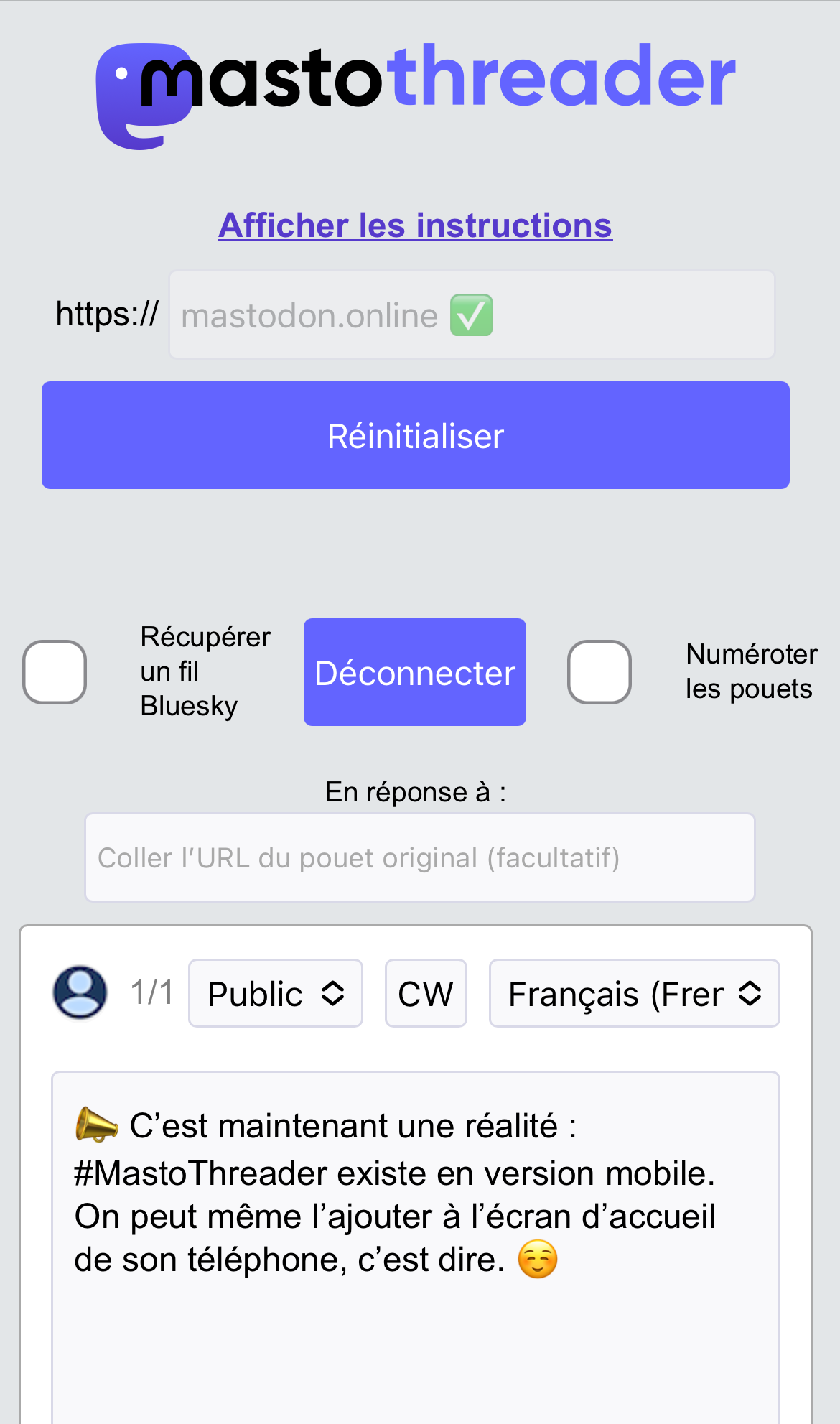 Oyez, oyez : #MastoThreader, mon application web pour poster des fils sur Mastodon, a subi un petit lifting, notamment avec une conception (j'espère) mieux adaptée à l'affichage sur mobile.
