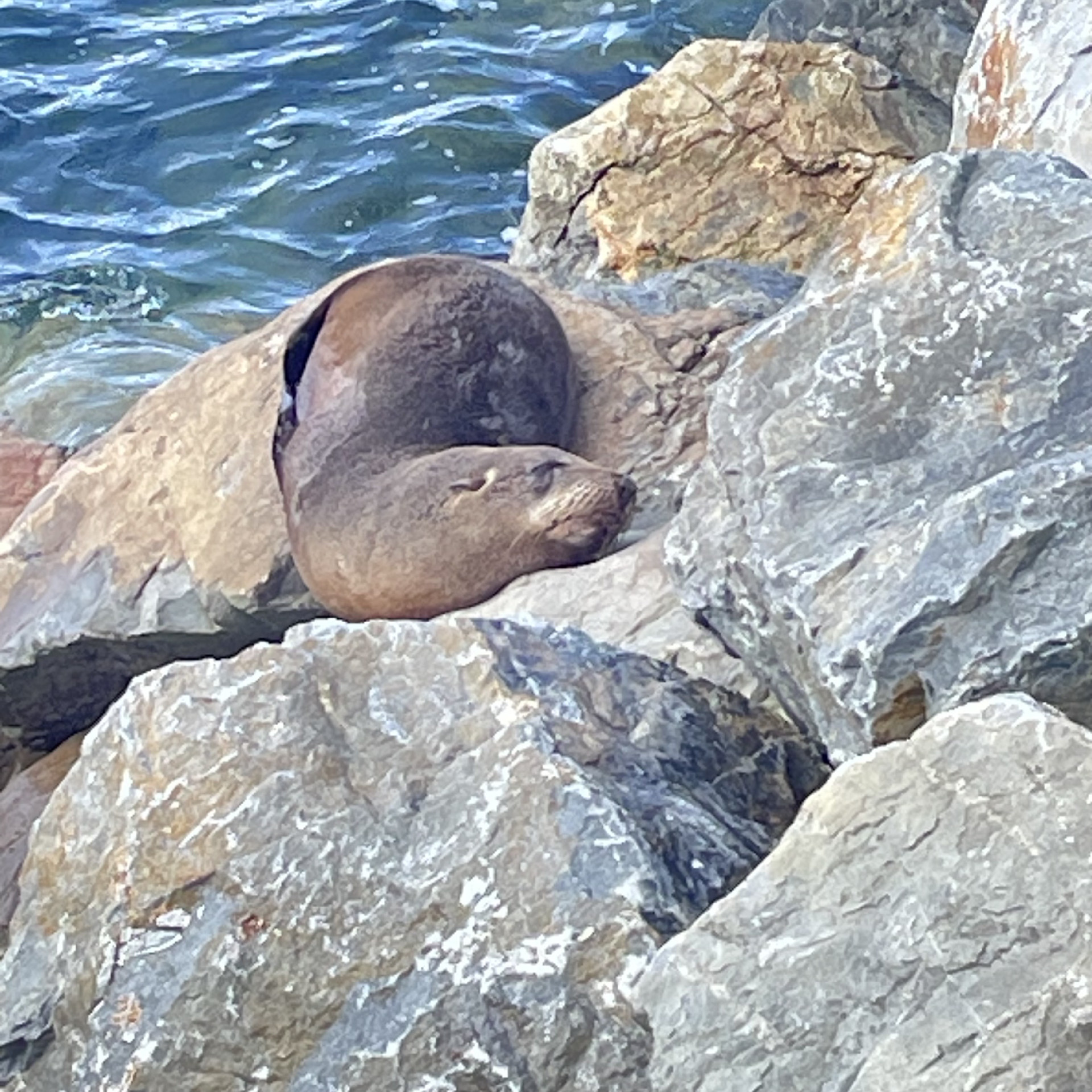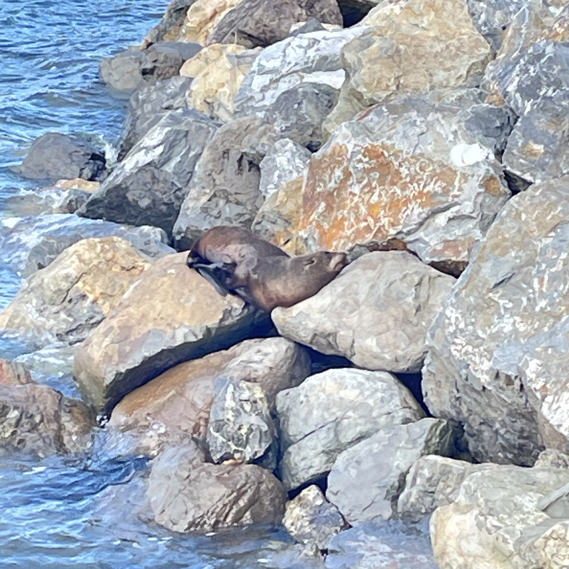 A juvenile NZ fur seal nestles among some boulders at water’s edge, enjoying a snooze in the sun. From this angle it is twisted like a sleeping cat with a fat bottom.