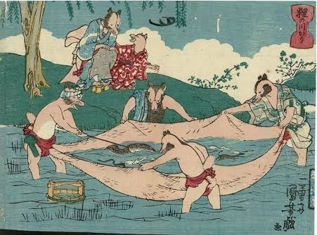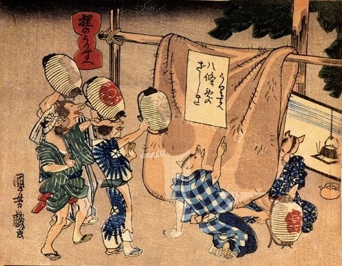 In #JapaneseFolklore tanuki are a shapeshifting #yokai with a special talent involving their magical expanding scrotums. #Ukiyoe artist Utagawa Kuniyoshi depicted them in a series of prints that are perfect for today's #WyrdWednesday. And these are just the tip of the tanuki testicle iceberg. 1/2