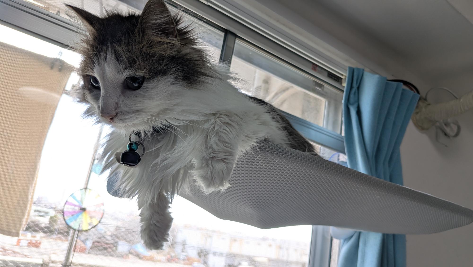 A Norwegian forest cat kitten lying on a cat shelf attached to a window with his front legs hanging over the edge. Side view.