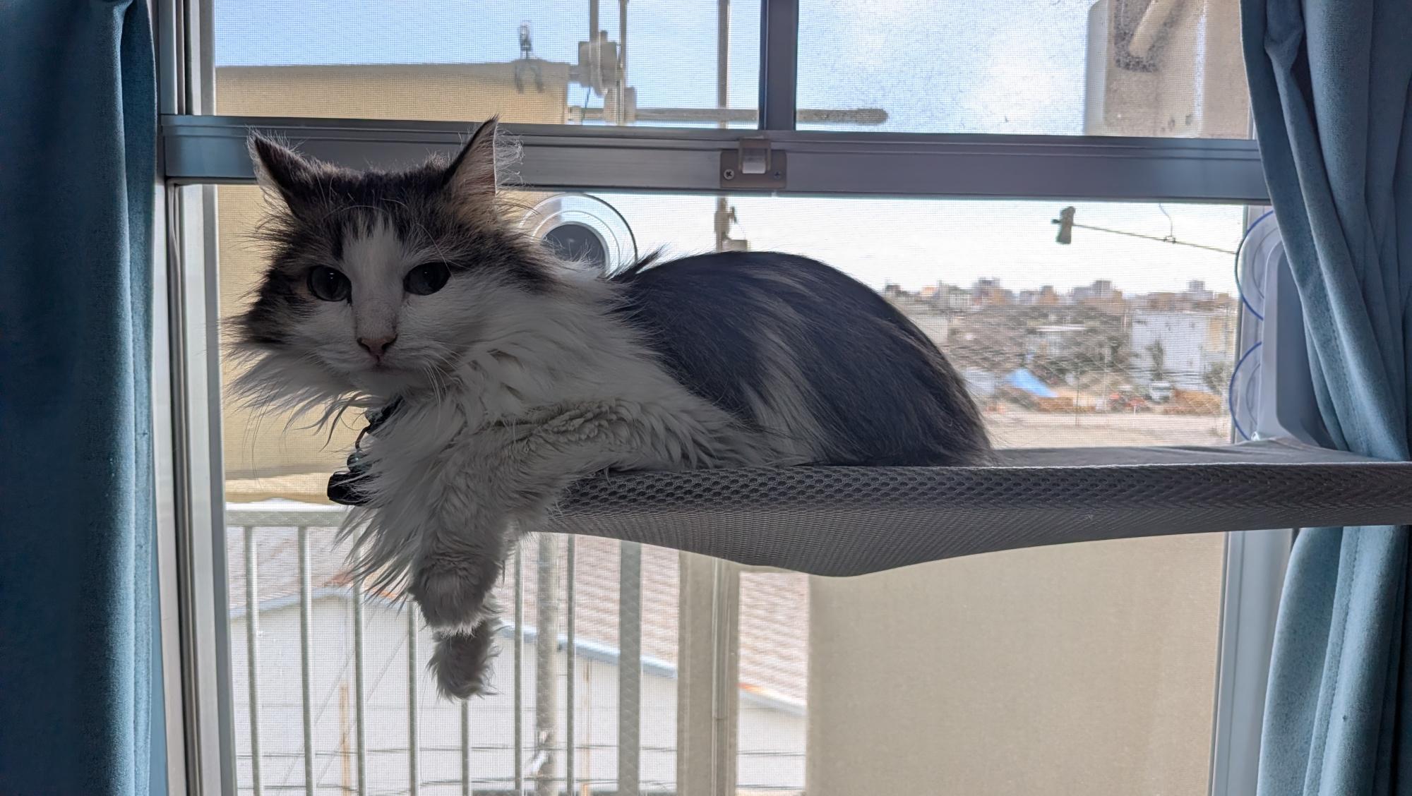A Norwegian forest cat kitten lying on a cat shelf attached to a window with his front legs hanging over the edge. Front view.