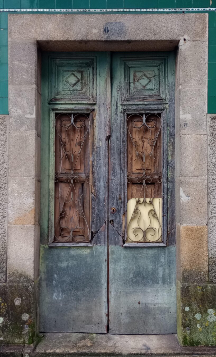Weathered, teal-painted wooden double doors with metal grilles and distressed wood panels, set within a grey stone doorway, with a green tiled section above and aged stonework sides. #portas #doors #laureanoaraujo #oporriño #galiza O Porriño, 3 de xaneiro de 2026