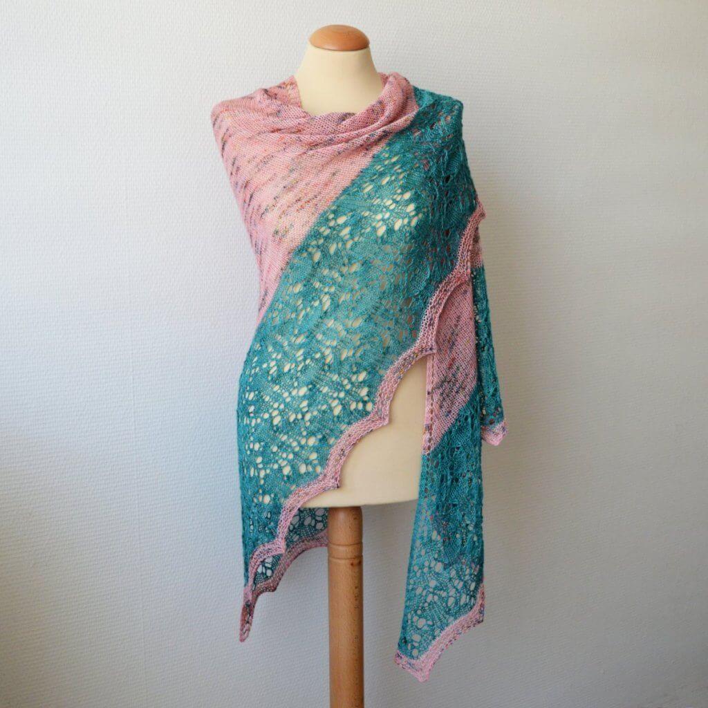 A knit shawl in pink variegated yarn with a lace border in turquoise, is shown from the front on a mannequin, against a white background.