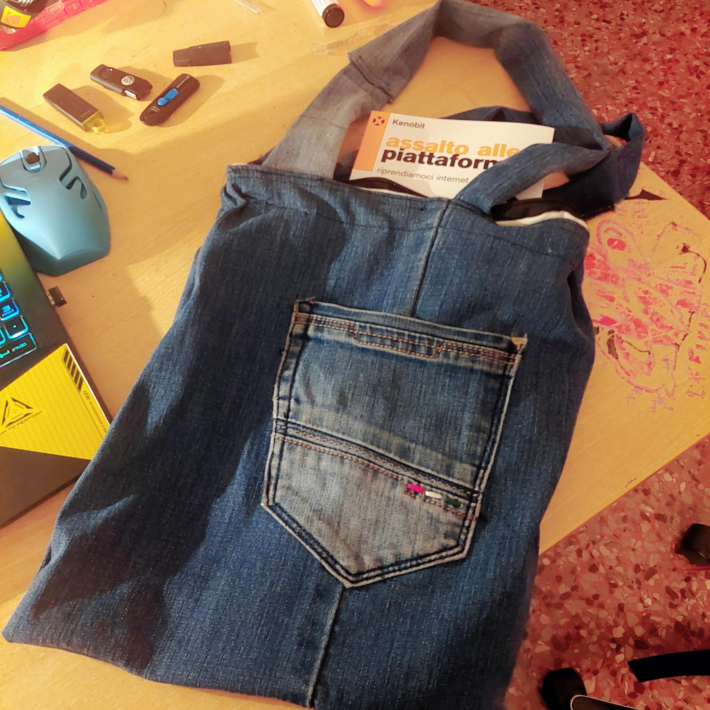 Oggi ho cucito con l'aiuto di una compagna questa meravigliosa borsa di jeans.
