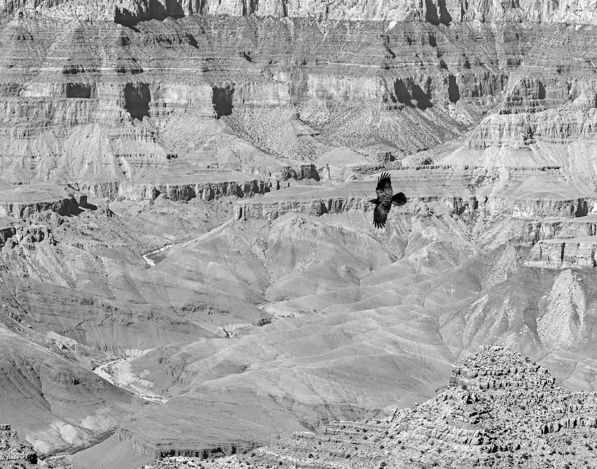 Corvus brachyrhynchos (American crow) surfing cliff side air waves over the Grand Canyon.
