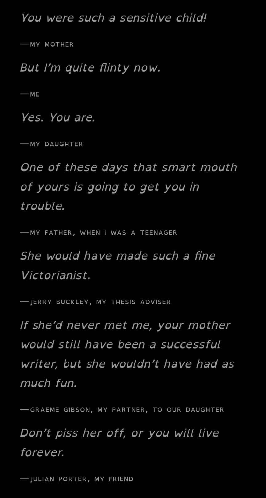 You were such a sensitive child! -MY MOTHER But I'm quite flinty now. -ME Yes. You are. -MY DAUGHTER One of these days that smart mouth of yours is going to get you in trouble. -MY FATHER, WHEN I WAS A TEENAGER She would have made such a fine Victorianist. -JERRY BUCKLEY, MY THESIS ADVISER If she'd never met me, your mother would still have been a successful writer, but she wouldn't have had as much fun. -GRAEME GIBSON, MY PARTNER, TO OUR DAUGHTER Don't piss her off, or you will live forever. -JULIAN PORTER, MY FRIEND