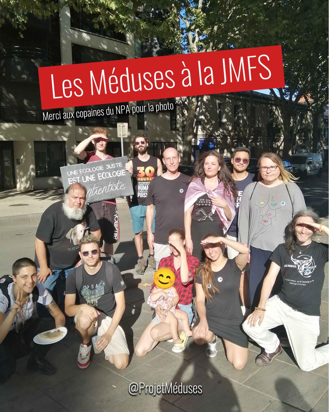 Photo montrant un groupe de personnes en plein cagnard avec la mention "Les Méduses à la JMFS - Merci aux copaines du NPA pour la photo"