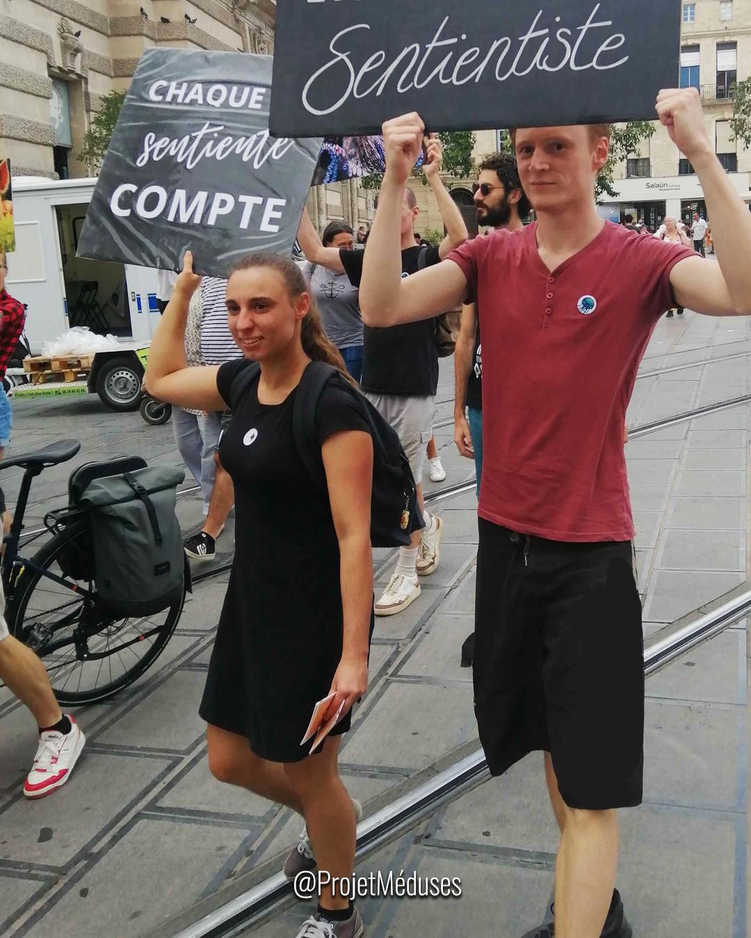 Photo de deux personnes, Lyla M et Yohann Hoarau, tenant des pancartes dans les rues de Montpellier. Sur celle tenue par Lyla, on peut lire "Chaque vie sentiente compte".
