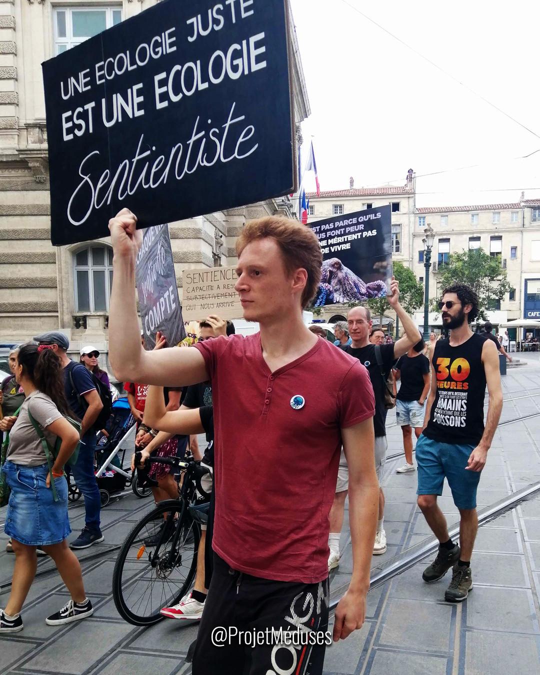 Photo de Yohann Hoarau dans les rues de Montpellier. Il tient une pancarte sur laquelle on peut lire ; "Une écologie juste est une écologie sentientiste".