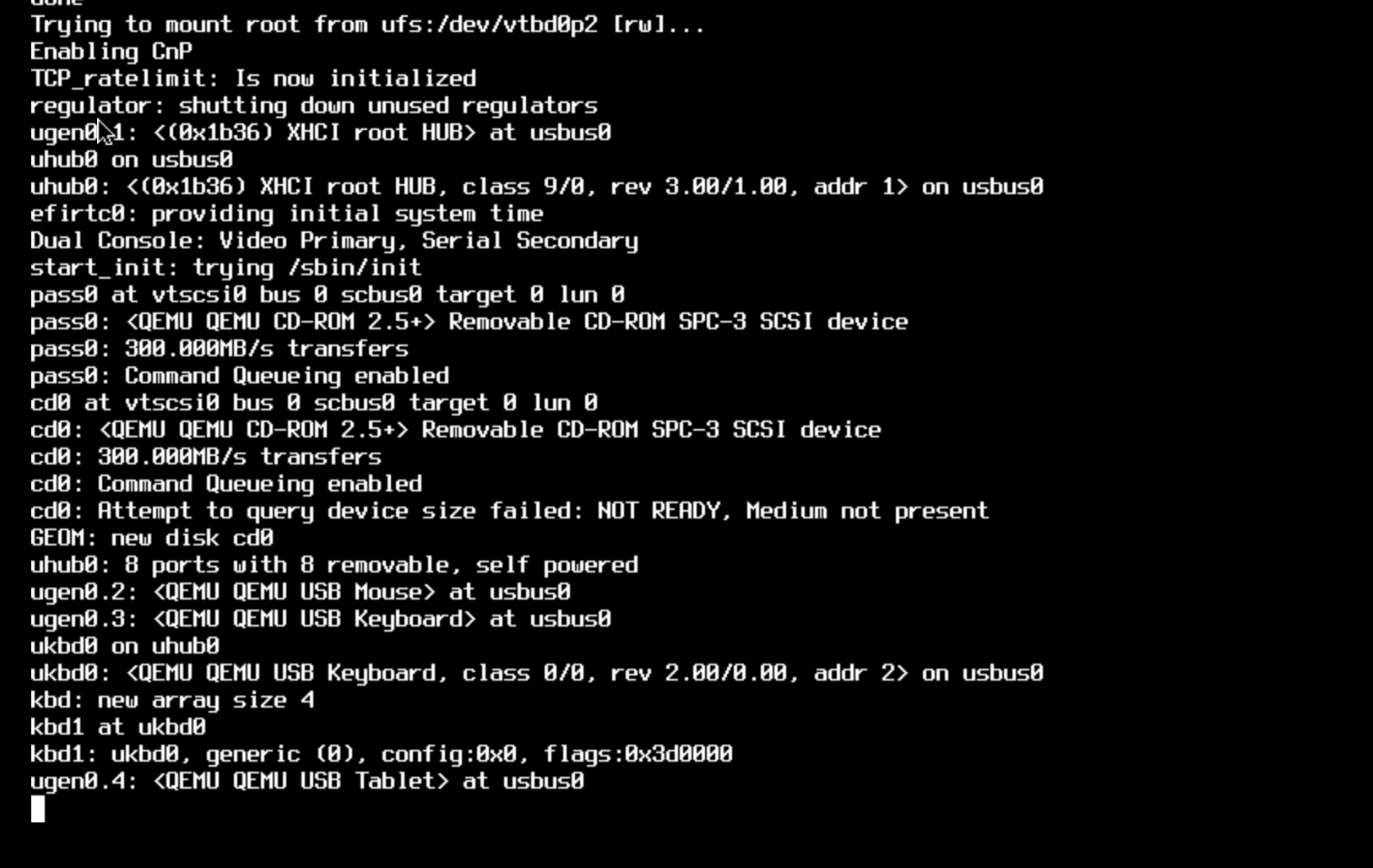 listing of freebsd boot screen output stuck at a particular spot Trying to mount root from ufs:/dev/vtbd0p2 [rw]... Enabling CnP TCP_ratelimit: Is now initialized regulator: shutting down unused regulators ugen01: <(0x1b36) XHCI root HUB> at usbus® uhub® on usbus® uhubB: <(0x1b36) XHCI root HUB, class 9/0, rev 3.00/1.00, addr 1> on usbus! efirtch: providing initial system time Dual Console: Video Primary, Serial Secondary start_init: trying /sbin/init passa at vtscsil bus 0 scbus target 8 lun B pass®: <QEMU QEMU CD-ROM 2.5+> Removable CD-ROM SPC-3 SCSI device pass0: 300.000MB/s transfers pass®: Command Queueing enabled cd at vtscsid bus 8 scbus target 8 lun B cd®: <QEMU QEMU CD-ROM 2.5+> Removable CD-ROM SPC-3 SCSI device cd8: 300.000MB/s transfers cdO: Command Queueing enabled cd®: Attempt to query device size failed: NOT READY, Medium not present GEOM: new disk cdo uhubb: 8 ports with 8 removable, self powered ugen0.2: <QEMU QEMU USB Mouse > at usbus® ugen0.3: <QEMU DEMU USB Keyboard> at usbus® ukbd0 on uhuba ukbd®: <QEMU QEMU USB Keyboard, class 0/0, rev 2.00/0.00, addr 2> on usbusB kbd: new array size 4 kbd1 at ukbd@