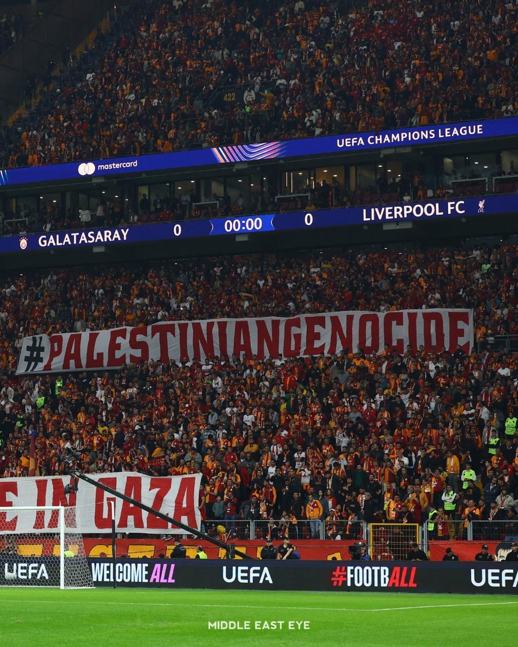 > Galatasaray supporters displayed banners reading 'Humanity lost consciousness in Gaza' and '#PalestinianGenocide' before their Uefa Champions League group stage match against Liverpool at Rams Park in Istanbul on 30 September.